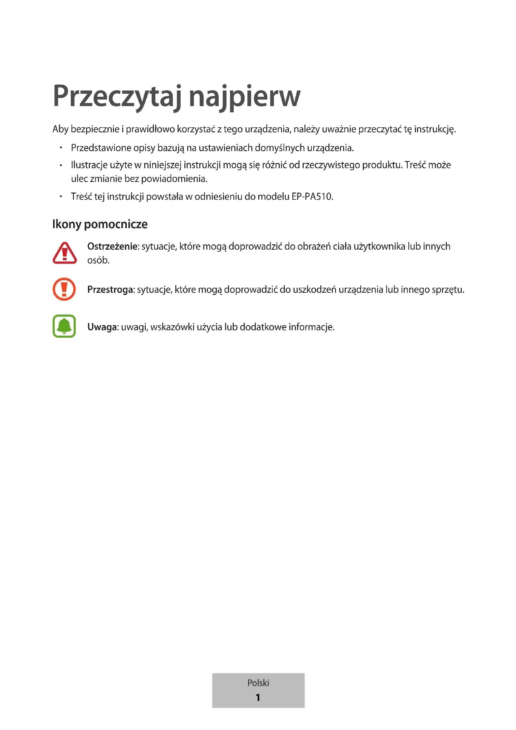 Treść tej instrukcji powstała w odniesieniu do modelu EP-PA510. Ikony pomocnicze Ostrzeżenie: sytuacje, które mogą doprowadzić do obrażeń ciała użytkownika lub innych osób. Przestroga: sytuacje, które mogą doprowadzić do uszkodzeń urządzenia lub innego sprzętu. Uwaga: uwagi, wskazówki użycia lub dodatkowe informacje. Polski