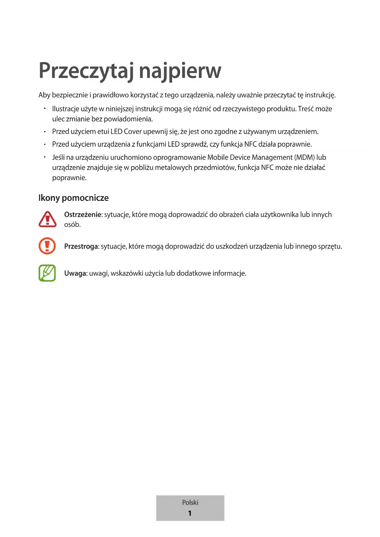 Jeśli na urządzeniu uruchomiono oprogramowanie Mobile Device Management (MDM) lub urządzenie znajduje się w pobliżu metalowych przedmiotów, funkcja NFC może nie działać poprawnie. Ikony pomocnicze Ostrzeżenie: sytuacje, które mogą doprowadzić do obrażeń ciała użytkownika lub innych osób. Przestroga: sytuacje, które mogą doprowadzić do uszkodzeń urządzenia lub innego sprzętu. Uwaga: uwagi, wskazówki użycia lub dodatkowe informacje. Polski