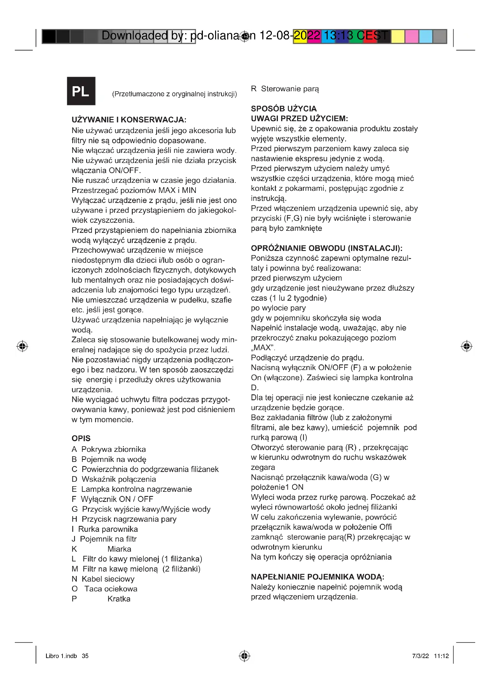 Dla tej operacji nie jest konieczne czekanie aż urządzenie będzie gorące. Bez zakładania ltrów (lub z założonymi ltrami, ale bez kawy), umieścić pojemnik pod rurką parową (I) Otworzyć sterowanie parą (R) , przekręcając w kierunku odwrotnym do ruchu wskazówek zegara Nacisnąć przełącznik kawa/woda (G) w położenie1 ON Wyleci woda przez rurkę parową. Poczekać aż wyleci równowartość około jednej liżanki W celu zakończenia wylewanie, powrócić przełącznik kawa/woda w położenie Of zamknąć sterowanie parą(R) przekręcając w odwrotnym kierunku Na tym kończy się operacja opróżniania NAPEŁNIANIE POJEMNIKA WODĄ: Należy koniecznie napełnić pojemnik wodą przed włączeniem urządzenia. PL (Przetłumaczone z oryginalnej instrukcji) Libro 1.indb 35 Libro 1.indb 35 7/3/22 11:12 7/3/22 11:12 Downloaded by: pd-oliana on 12-08-2022 13:13 CESTWyjąć pojemnik na wodę. Otworzyć pokrywę Napełnić zbiornik zimną wodą, przestrzegając poziomu MAX i MIN. Zamknąć pokrywę. Włożyć pojemnik na ltr do przegrody, up- ewniając się, że jest poprawnie zamontowany.