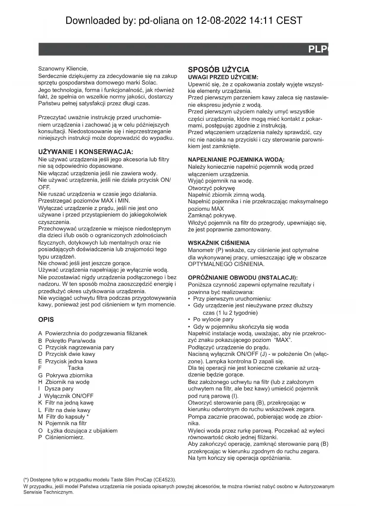 deşeurilor autorizat, în vederea colectării selective a deşeurilor de echipamente electrice şi electronice (WEEE) Acest aparat respectă Directiva 2014/35/ EU privind tensiunile joase, Directiva 2014/30/EU privind compatibilitatea electromagnetică, Directiva 2011/65/EU privind restricțiile de utilizare a anumitor substanțe periculoase în echipamentele electrice și electronice, precum și Directi- va 2009/125/EC privind proiectarea eco- logică a produselor cu impact energetic. Downloaded by: pd-oliana on 12-08-2022 14:11 CESTUŻYWANIE I KONSERWACJA: Nie używać urządzenia jeśli jego akcesoria lub ltry nie są odpowiednio dopasowane. Nie włączać urządzenia jeśli nie zawiera wody. Nie używać urządzenia, jeśli nie działa przycisk ON/ OFF. Nie ruszać urządzenia w czasie jego działania. Przestrzegać poziomów MAX i MIN. Wyłączać urządzenie z prądu, jeśli nie jest ono używane i przed przystąpieniem do jakiegokolwiek czyszczenia. Przechowywać urządzenie w miejsce niedostępnym dla dzieci i/lub osób o ograniczonych zdolnościach zycznych, dotykowych lub mentalnych oraz nie posiadających doświadczenia lub znajomości tego typu urządzeń. Nie chować jeśli jest jeszcze gorące. Używać urządzenia napełniając je wyłącznie wodą. Nie pozostawiać nigdy urządzenia podłączonego i bez nadzoru. W ten sposób można zaoszczędzić energię i przedłużyć okres użytkowania urządzenia. Nie wyciągać uchwytu ltra podczas przygotowywania kawy, ponieważ jest pod ciśnieniem w tym momencie. OPIS A Powierzchnia do podgrzewania liżanek B Pokrętło Para/woda C Przycisk nagrzewania pary D Przycisk dwie kawy E Przycisk jedna kawa F Tacka G Pokrywa zbiornika H Zbiornik na wodę I Dysza pary J Wyłącznik ON/OFF K Filtr na jedną kawę L Filtr na dwie kawy M Filtr do kapsuły * N Pojemnik na ltr O Łyżka dozująca z ubijakiem P Ciśnieniomierz. (*) Dostępne tylko w przypadku modelu Taste Slim ProCap (CE4523). W przypadku, jeśli model Państwa urządzenia nie posiada opisanych powyżej akcesoriów, te można również nabyć osobno w Autoryzowanym Serwisie Technicznym. Szanowny Kliencie, Serdecznie dziękujemy za zdecydowanie się na zakup sprzętu gospodarstwa domowego marki Solac. Jego technologia, forma i funkcjonalność, jak również fakt, że spełnia on wszelkie normy jakości, dostarczy Państwu pełnej satysfakcji przez długi czas. Przeczytać uważnie instrukcję przed uruchomie- niem urządzenia i zachować ją w celu późniejszych konsultacji. Niedostosowanie się i nieprzestrzeganie niniejszych instrukcji może doprowadzić do wypadku.