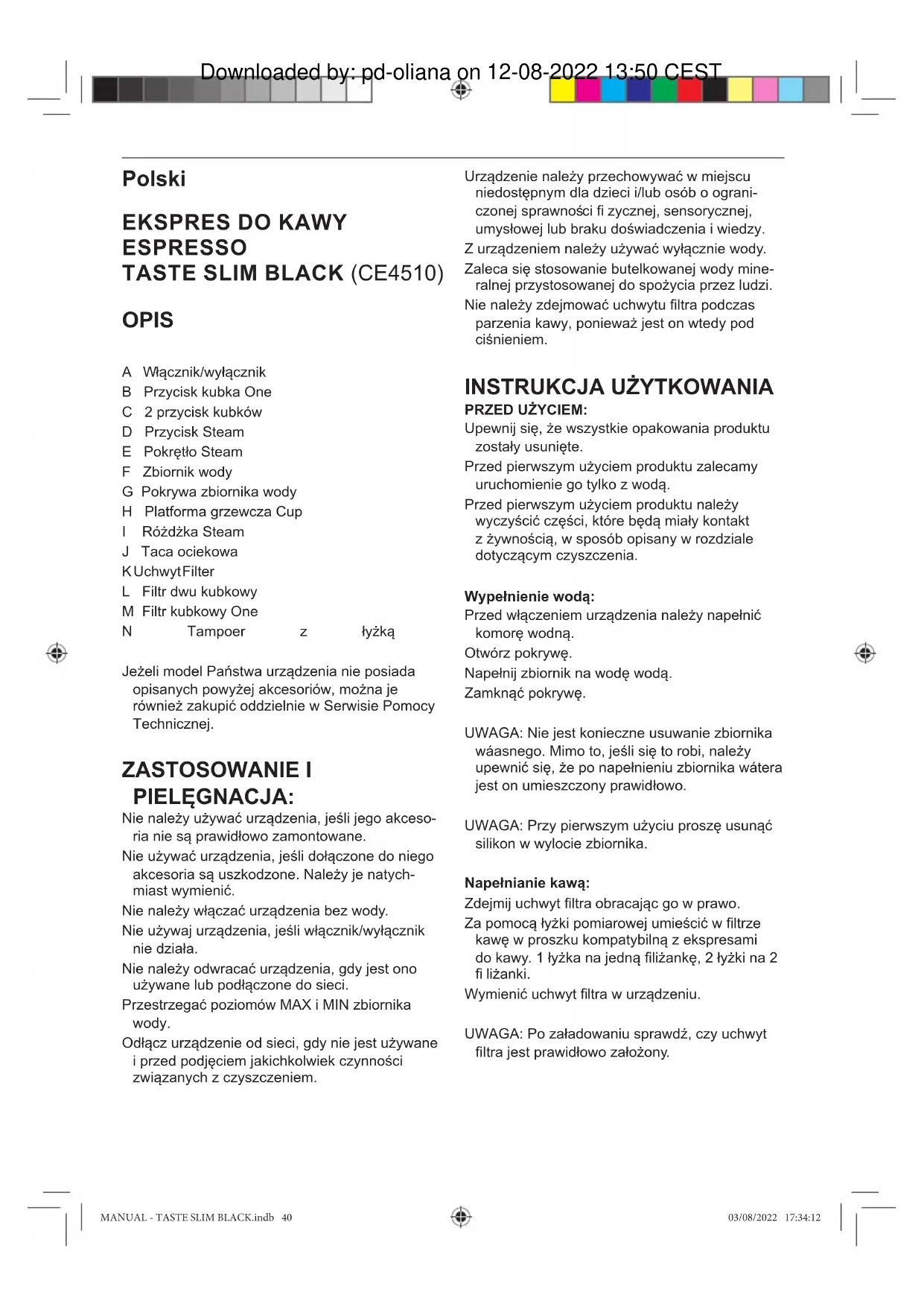 ESPRESSO TASTE SLIM BLACK (CE4510) OPIS A Włącznik/wyłącznik B Przycisk kubka One C 2 przycisk kubków D Przycisk Steam E Pokrętło Steam F Zbiornik wody G Pokrywa zbiornika wody H Platforma grzewcza Cup I Różdżka Steam J Taca ociekowa K Uchwyt Filter L Filtr dwu kubkowy M Filtr kubkowy One N Tampoer z łyżką Jeżeli model Państwa urządzenia nie posiada opisanych powyżej akcesoriów, można je również zakupić oddzielnie w Serwisie Pomocy Technicznej. ZASTOSOWANIE I PIELĘGNACJA: Nie należy używać urządzenia, jeśli jego akceso- ria nie są prawidłowo zamontowane. Nie używać urządzenia, jeśli dołączone do niego akcesoria są uszkodzone. Należy je natych- miast wymienić. Nie należy włączać urządzenia bez wody. Nie używaj urządzenia, jeśli włącznik/wyłącznik nie działa. Nie należy odwracać urządzenia, gdy jest ono używane lub podłączone do sieci. Przestrzegać poziomów MAX i MIN zbiornika wody. Odłącz urządzenie od sieci, gdy nie jest używane i przed podjęciem jakichkolwiek czynności związanych z czyszczeniem. Urządzenie należy przechowywać w miejscu niedostępnym dla dzieci i/lub osób o ograni- czonej sprawnoś ci fi zycznej, sensorycznej, umysłowej lub braku doświadczenia i wiedzy. Z urządzeniem należy używać wyłącznie wody. Zaleca się stosowanie butelkowanej wody mine- ralnej przystosowanej do spożycia przez ludzi. Nie należy zdejmować uchwytu fi ltra podczas parzenia kawy, ponieważ jest on wtedy pod ciśnieniem.
