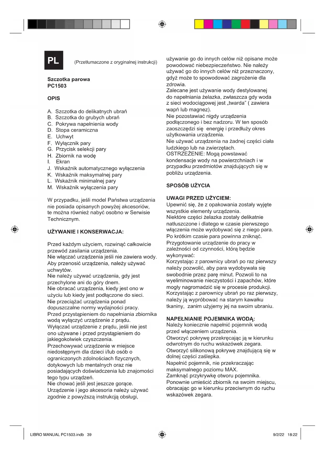 UWAGI PRZED UŻYCIEM: Upewnić się, że z opakowania zostały wyjęte wszystkie elementy urządzenia. Niektóre części żelazka zostały delikatnie natłuszczone i dlatego w czasie pierwszego włączenia może wydobywać się z niego para. Po krótkim czasie para powinna zniknąć. Przygotowanie urządzenie do pracy w zależności od czynności, którą będzie wykonywać: Korzystając z parownicy ubrań po raz pierwszy należy pozwolić, aby para wydobywała się swobodnie przez parę minut. Pozwoli to na wyeliminowanie nieczystości i zapachów, które mogły nagromadzić się w procesie produkcji. Korzystając z parownicy ubrań po raz pierwszy, należy ją wypróbować na starym kawałku tkaniny, zanim użyjemy jej na swoim ubraniu. NAPEŁNIANIE POJEMNIKA WODĄ: Należy koniecznie napełnić pojemnik wodą przed włączeniem urządzenia. Otworzyć pokrywę przekręcając ją w kierunku odwrotnym do ruchu wskazówek zegara. Otworzyć silikonową pokrywę znajdującą się w dolnej części zaślepka. Napełnić pojemnik, nie przekraczając maksymalnego poziomu MAX. Zamknąć przykrywkę otworu pojemnika. Ponownie umieścić zbiornik na swoim miejscu, obracając go w kierunku przeciwnym do ruchu wskazówek zegara. PL (Przetłumaczone z oryginalnej instrukcji) LIBRO MANUAL PC1503.indb 39LIBRO MANUAL PC1503.indb 39 9/2/22 18:229/2/22 18:22UŻYCIE: Całkowicierozwinąć kabel przed podłączeniem urządzenia. Podłączyć urządzenie do prądu. Nacisnąć przycisk selekcji pary i wybrać pomiędzy pozycjami “Bez Pary”, “ECO” i “MAX”. Wskaźnik będzie mrugać aż osiągnie pożądaną temperaturę. Nacisnąć przycisk para, aby rozpocząć użycie pary. UWAGA: Nie jest konieczne trzymanie przycisku wciśniętego, aby uzyskać parę. Kiedy już nie chcemy więcej pary, należy nacisnąć ponownie przycisk pary, aby zakończyć prasowanie parą. Ustawić urządzenie w taki sposób, aby para wylatywała w pożądanym kierunku.. UWAGA: Jeśli tryb nie zostanie zmieniony, urządzenie będzie emitował parę co 25 sekund.. PRASOWANIE UBRAŃ PARĄ: Parownica do ubrań jest łatwa w użyciu i idealna do usuwania zagnieceń lub fałd ubrań i zasłon, a także w celu odświeżenia tekstyliów domowych. Można ją stosować do większości tkanin, pod warunkiem, że ubranie będzie zawieszone lub gdzie parownica może być używana z łatwością w pozycji pionowej, przemieszczając ją po ubraniu w górę i w dół. UWAGA: parownica do ubrań jest przeznaczona do stosowania w pozycji pionowej na zawieszanych ubraniach. Powstrzymać się od stosowania parownicy na ubraniach umieszczonych w pozycji poziomej. Powiesić ubranie na wieszaku i wygładź lekko ręką tkaninę. Upewnić się, że istnieje wentylacja z tyłu tkaniny. Upewnić się, że kieszenie ubrania są puste. UWAGA: Zaleca się nie nanosić pary na elementy i akcesoria metalowe. Należy postępować ostrożnie rozpylając parę wokół akcesoriów metalowych. Prasowanie zasłon parą