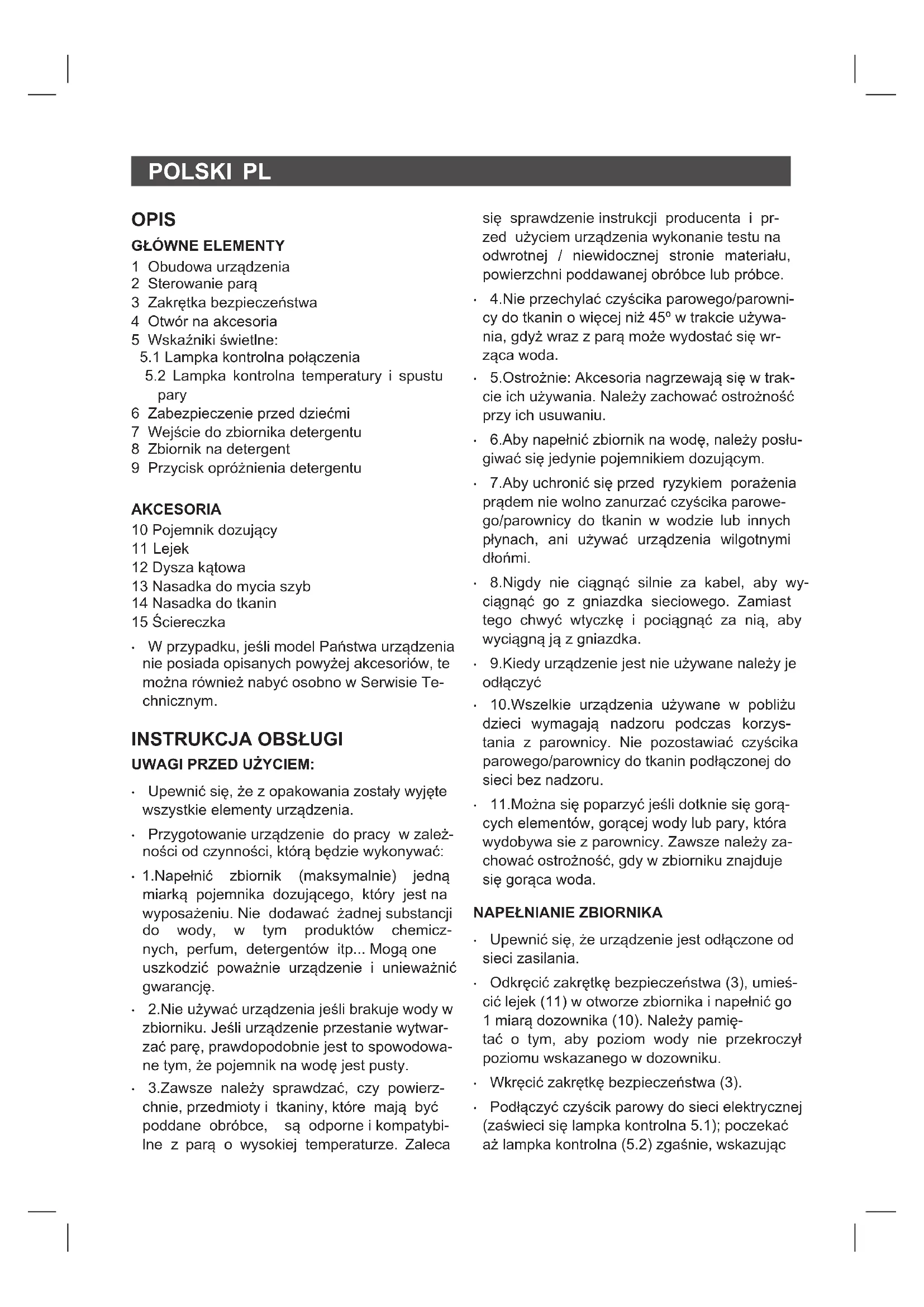 pary 6 Zabezpieczenie przed dziećmi 7 Wejście do zbiornika detergentu 8 Zbiornik na detergent 9 Przycisk opróżnienia detergentu AKCESORIA 10 Pojemnik dozujący 11 Lejek 12 Dysza kątowa 13 Nasadka do mycia szyb 14 Nasadka do tkanin 15 Ściereczka
