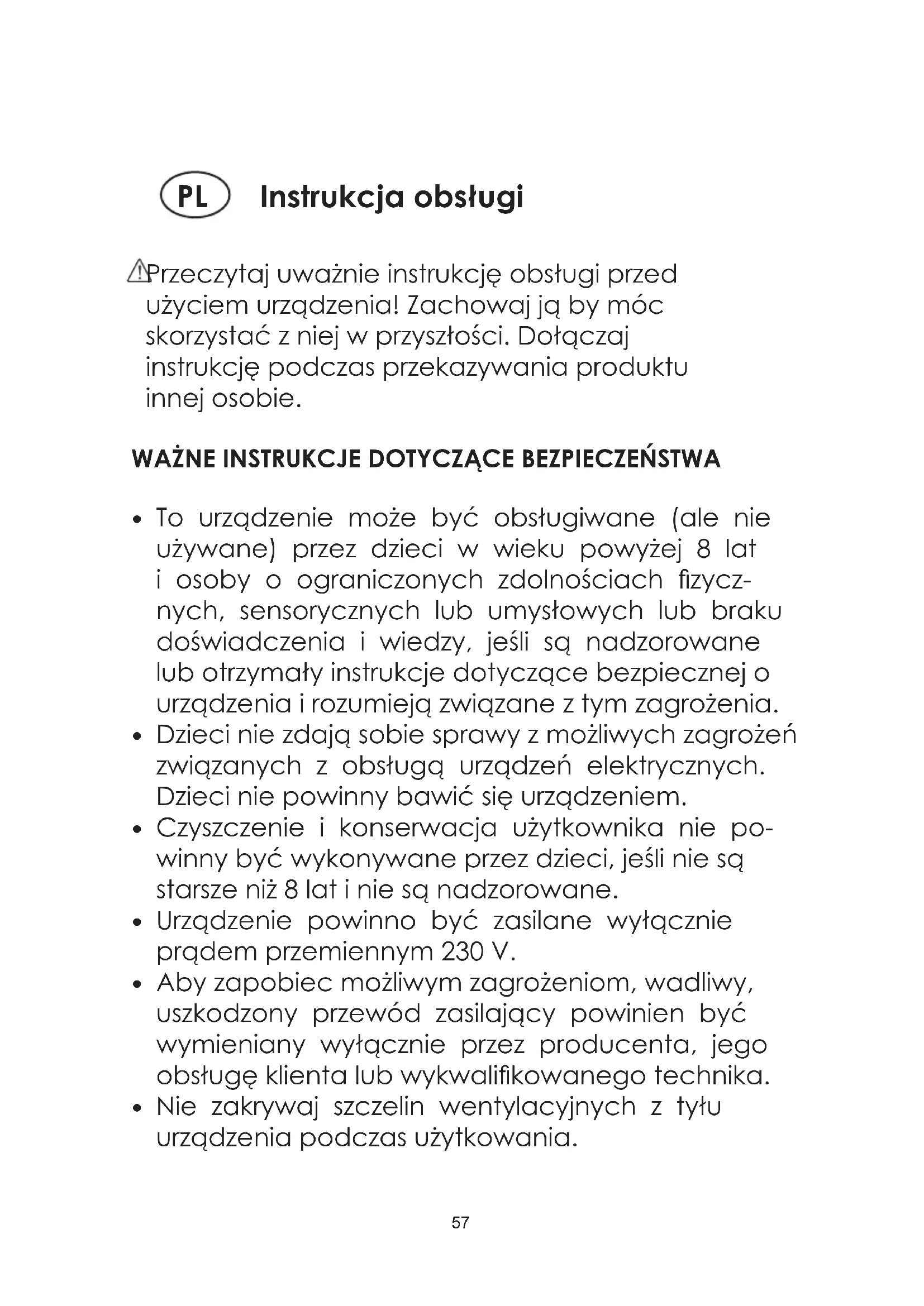 PL Instrukcja obsługi Przeczytaj uważnie instrukcję obsługi przed użyciem urządzenia! Zachowaj ją by móc skorzystać z niej w przyszłości. Dołączaj instrukcję podczas przekazywania produktu innej osobie. WAŻNE INSTRUKCJE DOTYCZĄCE BEZPIECZEŃSTWA To urządzenie może być obsługiwane (ale nie używane) przez dzieci w wieku powyżej 8 lat i osoby o ograniczonych zdolnościach zycz- nych, sensorycznych lub umysłowych lub braku doświadczenia i wiedzy, jeśli są nadzorowane lub otrzymały instrukcje dotyczące bezpiecznej o urządzenia i rozumieją związane z tym zagrożenia. Dzieci nie zdają sobie sprawy z możliwych zagrożeń związanych z obsługą urządzeń elektrycznych. Dzieci nie powinny bawić się urządzeniem. Czyszczenie i konserwacja użytkownika nie po- winny być wykonywane przez dzieci, jeśli nie są starsze niż 8 lat i nie są nadzorowane. Urządzenie powinno być zasilane wyłącznie prądem przemiennym 230 V. Aby zapobiec możliwym zagrożeniom, wadliwy, uszkodzony przewód zasilający powinien być wymieniany wyłącznie przez producenta, jego obsługę klienta lub wykwalikowanego technika. Nie zakrywaj szczelin wentylacyjnych z tyłu urządzenia podczas użytkowania.