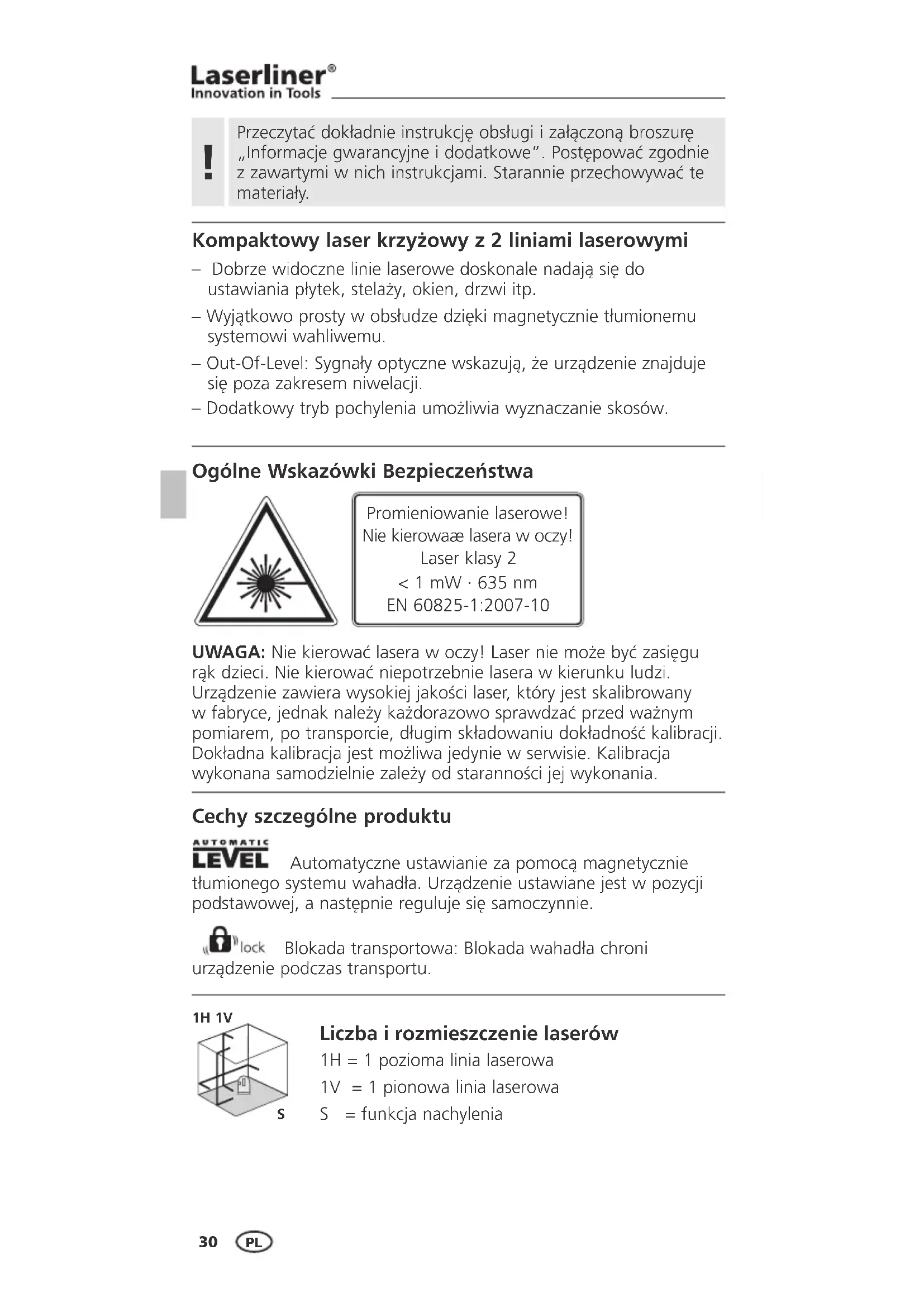 punto avrete un riferimento orizzontale tra A1 e A2. Verifica della linea verticale: collocare l‘apparecchio a circa 5 m da una parete. Fissare alla parete un filo a piombo lungo 2,5 m; il piombo deve poter oscillare liberamente. Accendere l‘apparecchio e puntare il laser verticale sul filo a piombo. La precisione rientra nella tolleranza se lo scostamento tra la linea laser ed il filo a piombo non è maggiore di ± 1,5 mm. Verifica della linea orizzontale: Collocare l‘apparecchio a circa 5 m da una parete ed attivare la croce di collimazione laser. Segnare il punto B sulla parete. Ruotare la croce di collimazione laser di circa 2,5 m verso destra e segnare il punto C. Controllare se la linea orizzontale passante per il punto C si trova alla stessa altezza del punto B ± 2 mm. Ripetere la procedura ruotando la croce di collimazione verso sinistra. IT30 Kompaktowy laser krzyŏowy z 2 liniami laserowymi – Dobrze widoczne linie laserowe doskonale nadajŅ siŐ do ustawiania pÙytek, stelaży, okien, drzwi itp. – WyjŅtkowo prosty w obsÙudze dziŐki magnetycznie tÙumionemu systemowi wahliwemu. – Out-Of-Level: SygnaÙy optyczne wskazujŅ, że urzŅdzenie znajduje siŐ poza zakresem niwelacji. – Dodatkowy tryb pochylenia umożliwia wyznaczanie skosów. Cechy szczególne produktu Automatyczne ustawianie za pomocŅ magnetycznie tÙumionego systemu wahadÙa. UrzŅdzenie ustawiane jest w pozycji podstawowej, a nastŐpnie reguluje siŐ samoczynnie. Blokada transportowa: Blokada wahadÙa chroni urzŅdzenie podczas transportu. UWAGA: Nie kierowaņ lasera w oczy! Laser nie może byņ zasiŐgu rŅk dzieci. Nie kierowaņ niepotrzebnie lasera w kierunku ludzi. UrzŅdzenie zawiera wysokiej jakoūci laser, który jest skalibrowany w fabryce, jednak należy każdorazowo sprawdzaņ przed ważnym pomiarem, po transporcie, dÙugim skÙadowaniu dokÙadnoūņ kalibracji. DokÙadna kalibracja jest możliwa jedynie w serwisie. Kalibracja wykonana samodzielnie zależy od starannoūci jej wykonania. Ogólne Wskazówki BezpieczeĞstwa Promieniowanie laserowe! Nie kierowaæ lasera w oczy! Laser klasy 2 < 1 mW · 635 nm EN 60825-1:2007-10 Liczba i rozmieszczenie laserów 1H = 1 pozioma linia laserowa 1V = 1 pionowa linia laserowa S = funkcja nachylenia