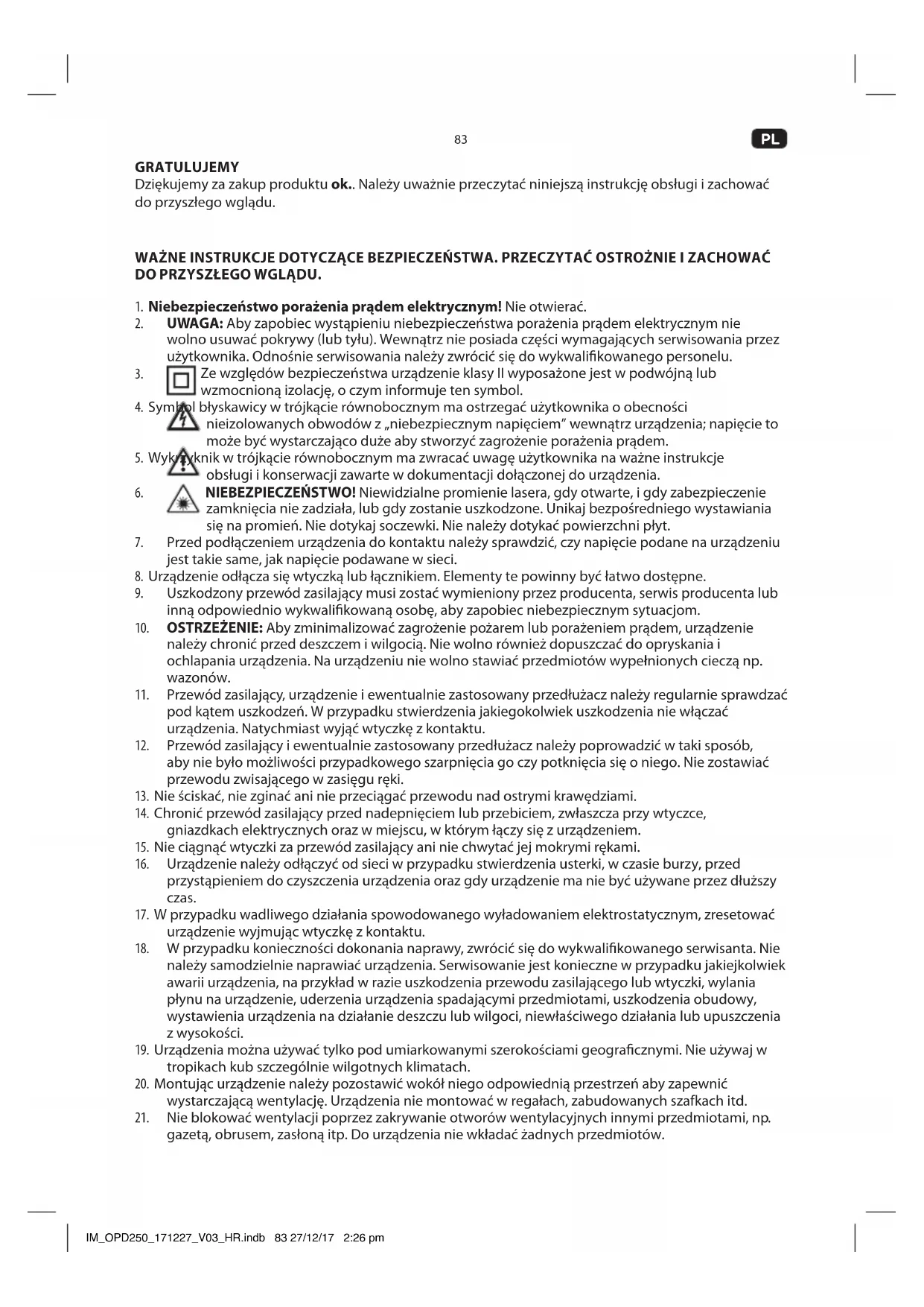 gazetą, obrusem, zasłoną itp. Do urządzenia nie wkładać żadnych przedmiotów. IM_OPD250_171227_V03_HR.indb 83 27/12/17 2:26 pm84