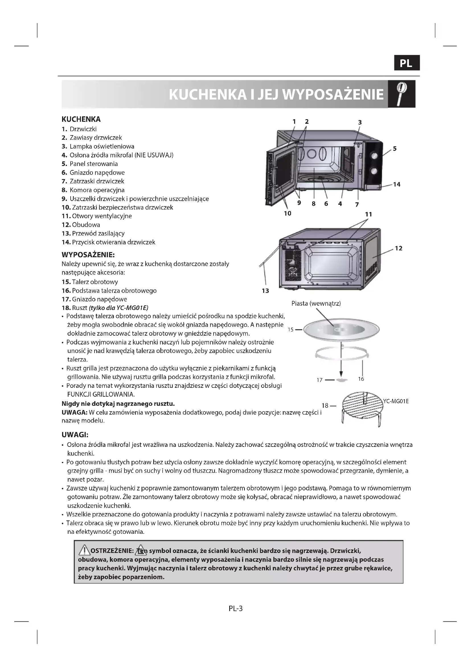 KUCHENKA 1. Drzwiczki2. Zawiasy drzwiczek3. Lampka oświetleniowa4. Osłona źródła mikrofal (NIE USUWAJ)5. Panel sterowania6. Gniazdo napędowe7. Zatrzaski drzwiczek8. Komora operacyjna9. Uszczelki drzwiczek i powierzchnie uszczelniające10. Zatrzaski bezpieczeństwa drzwiczek11. Otwory wentylacyjne12. Obudowa13. Przewód zasilający14. Przycisk otwierania drzwiczek WYPOSAŻENIE: Należy upewnić się, że wraz z kuchenką dostarczone zostały następujące akcesoria:15. Talerz obrotowy16. Podstawa talerza obrotowego17. Gniazdo napędowe18. Ruszt (tylko dla YC-MG01E)• Podstawę talerza obrotowego należy umieścić pośrodku na spodzie kuchenki, żeby mogła swobodnie obracać się wokół gniazda napędowego. A następnie dokładnie zamocować talerz obrotowy w gnieździe napędowym.• Podczas wyjmowania z kuchenki naczyń lub pojemników należy ostrożnie unosić je nad krawędzią talerza obrotowego, żeby zapobiec uszkodzeniu talerza. • Ruszt grilla jest przeznaczona do użytku wyłącznie z piekarnikami z funkcją grillowania. Nie używaj rusztu grilla podczas korzystania z funkcji mikrofal.• Porady na temat wykorzystania rusztu znajdziesz w części dotyczącej obsługi FUNKCJI GRILLOWANIA.Nigdy nie dotykaj nagrzanego rusztu.UWAGA: W celu zamówienia wyposażenia dodatkowego, podaj dwie pozycje: nazwę części i nazwę modelu. UWAGI: