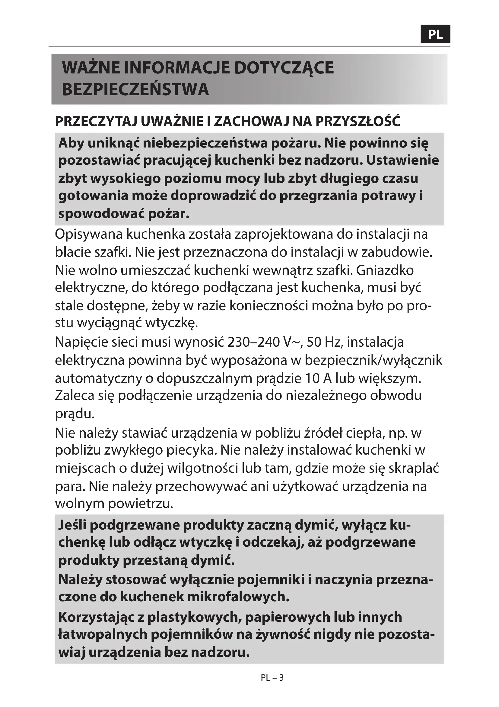 - Nie wolno pozwalać dzieciom, żeby zbliżały się do drzwiczek podczas pracy kuchenki, ponieważ mogłyby się poparzyć. OSTRZEŻENIE: Dzieci w wieku od ośmiu lat mogą korzy- stać z kuchenki bez nadzoru tylko, jeśli zostały szczegó- łowo poinstruowane o sposobie bezpiecznego używania urządzenia i rozumieją ryzyko związane z niewłaściwym użyciem. Dzieci mogą korzystać z kuchenki wyłącznie pod nadzo- rem opiekunów, jeśli urządzenie pracuje w trybie GRILL, PRACY KOMBINOWANEJ Z GRILLEM, PRACY Z TERMOOBIE- GIEM lub PROGRAMIE AUTOMATYCZNEGO GOTOWANIA (dostępne tryby pracy zależą od modelu kuchenki), ponie- waż kuchenka w tym czasie jest bardzo gorąca. Urządzenie to nie mo że być obsługiwane przez osoby (włącznie z dziećmi) z obniżonymi zdolnościami zyczny- mi, zmysłowymi bądź umysłowymi, a także przez osoby bez doświadczenia i wiedzy na temat obsługi, chyba że dostały pozwolenie, bądź udzielono im instrukcji obsługi PL – 9PL PL – 8 PL – 9PL – 9 urządzenia przez osobę odpowiedzialną za ich bezpie- czeństwo. Dzieci powinny pozostawać pod opieką, aby nie bawiły się urządzeniem. Czyszczenie kuchenki przeprowadzane przez dzieci powinno być monitorowane. Modele z elektronicznym panelem dotykowym obsługują tryb blokady rodzicielskiej. Nie wolno opierać się ani huśtać na drzwiczkach kuchenki. Nie wolno traktować kuchenki jako przedmiotu do zabawy. Dzieciom należy wpoić zasady bezpieczeństwa: używanie ręka- wic kuchennych, ostrożne zdejmowanie pokrywek, zachowanie szczególnej ostrożności co do opakowań (np. materiałów sa- monagrzewających się), gdyż opakowania te mogą być bardzo gorące. Inne ostrzeżenia: Nie wolno w żaden sposób samodzielnie dokonywać mody ka- cji kuchenki. Nie wolno poruszać kuchenką podczas jej pracy. Opisywane urządzenie przeznaczone jest tylko do użytku w gospodarstwach domowych. Kuchenka służy wyłącznie do przygotowywania potraw i napojów w warunkach domowych i można jej używać tylko do takich celów. Suszenie żywności lub odzieży oraz ogrzewanie poduszek rozgrzewających, kapci, gąbek, wilgotnych ściereczek itp. może doprowadzić do obra- żeń, zapalenia się lub pożaru. Kuchenka nie jest przeznaczona do użytku przemysłowego ani laboratoryjnego. Żeby zapewnić niezawodną pracę kuchenki i uniknąć uszkodzeń: Nigdy nie należy włączać pustej kuchenki. Używając naczynia powodującego rumienienie potraw lub materiałów samona- grzewających się, zawsze nale ży pod nimi umieścić izolację termiczną, na przykład porcelanowy talerz, aby zapobiec uszko- dzeniu podstawy urządzenia na skutek nadmiernego wzrostuPL – 10PL – 10 temperatury. Niedopuszczalne jest przekraczanie czasu pod- grzewania, podanego w przepisach. Nie wolno używać naczyń metalowych odbijających mikrofale i mogących spowodować powstawanie łuków elektrycznych. Nie wkładaj do kuchenki puszek. Aby zapobiec pęknięciu talerza obrotowego lub podstawy kuchenki: a) Przed rozpoczęciem mycia wodą należy odczekać dopóki kuchenka nie ostygnie. b) Nie wolno ustawiać gorących ani zimnych produktów lub naczyń na zimnej podstawie kuchenki. c) Podczas pracy urządzenia nie należy na jego obudowie stawiać jakichkolwiek przedmiotów. UWAGA: Nie wolno używać plastikowych naczyń, jeśli komora operacyj- na nie ostygła jeszcze po użyciu w trybie pracy kombinowanej (w zależności od modelu kuchenki), ponieważ mogłyby się roztopić. W wymienionych trybach nie wolno używać plastikowych na- czyń, o ile ich producent nie zaznaczył, że są one do tego celu przeznaczone. W przypadku wątpliwości co do sposobu przyłączenia kuchen- ki należy skontaktować się z upoważnionym, wykwali kowa- nym elektrykiem. Producent ani sprzedawca nie ponoszą żadnej odpowiedzial- ności za uszkodzenie kuchenki lub obrażenia ciała, powstałe wskutek zaniedbania poprawnych połączeń elektrycznych. Na ściankach kuchenki lub wokół uszczelki drzwiczek może czasami pojawiać się para wodna lub krople wody. Jest to zja- wisko normalne i nie świadczy o wydobywaniu się mikrofal na zewnątrz ani o wadliwym działaniu kuchenki. Opisywane urządzenie przeznaczone jest do użytku w go- spodarstwach domowych i w podobnych zastosowaniach: w PL – 11PL PL – 10 PL – 11PL – 11 pomieszczeniach kuchennych przeznaczonych dla personelu w sklepach, biurach i innych miejscach pracy / w gospodarstwach rolnych / przez klientów w hotelach, motelach i innych miej- scach zakwaterowania / w pensjonatach. Ten symbol oznacza, że ścianki kuchenki bardzo się nagrzewają.PL – 12PL – 12 INSTALACJA