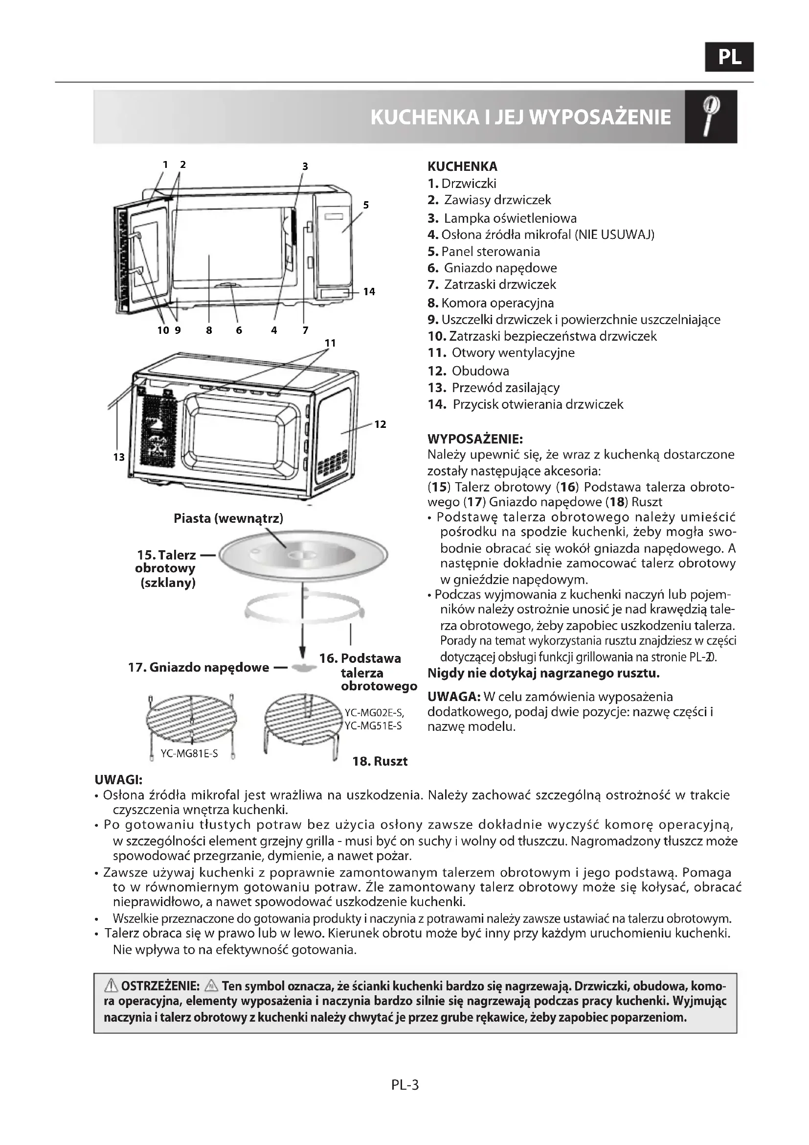 - Podczas wyjmowania z kuchenki naczyń lub pojem- ników należy ostrożnie unosić je nad krawędzią tale- rza obrotowego, żeby zapobiec uszkodzeniu talerza. Porady na temat wykorzystania rusztu znajdziesz w części dotyczącej obsługi funkcji grillowania na stronie PL- 0. Nigdy nie dotykaj nagrzanego rusztu.
