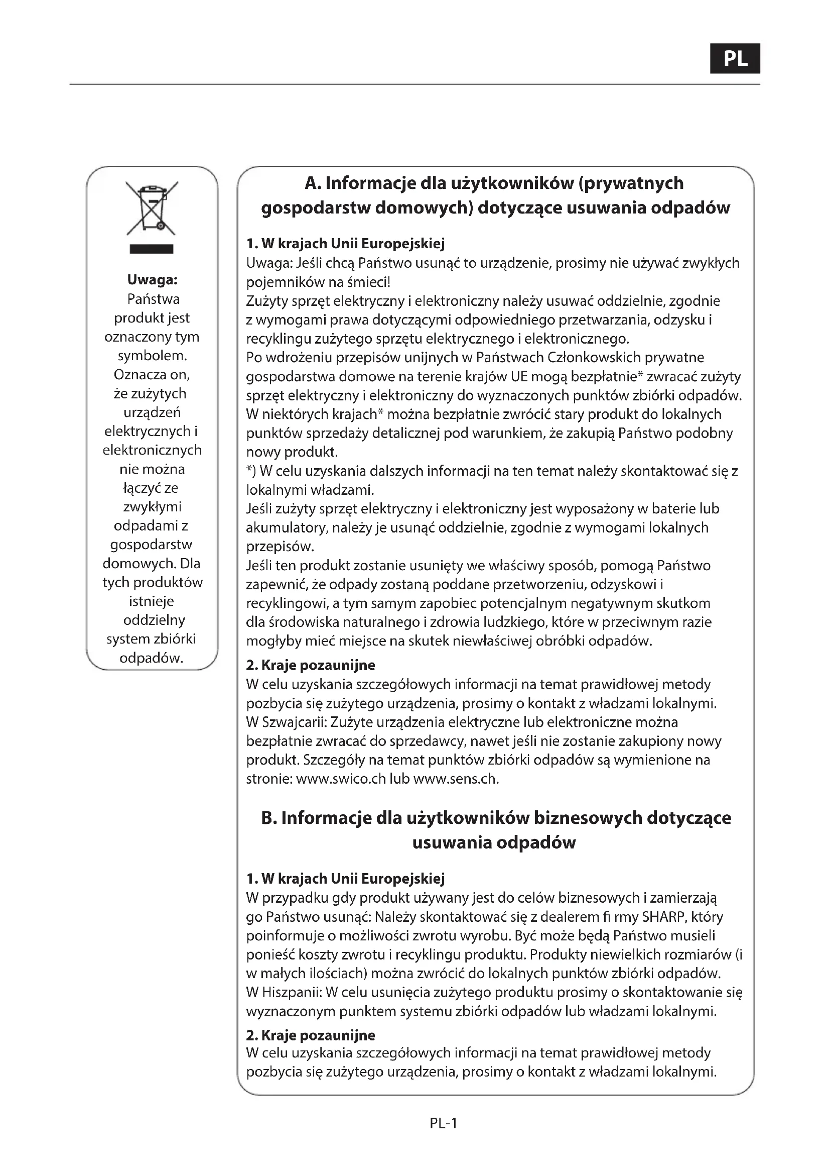 W przypadku gdy produkt używany jest do celów biznesowych i zamierzają go Państwo usunąć: Należy skontaktować się z dealerem rmy SHARP, który poinformuje o możliwości zwrotu wyrobu. Być może będą Państwo musieli ponieść koszty zwrotu i recyklingu produktu. Produkty niewielkich rozmiarów (i w małych ilościach) można zwrócić do lokalnych punktów zbiórki odpadów. W Hiszpanii: W celu usunięcia zużytego produktu prosimy o skontaktowanie się wyznaczonym punktem systemu zbiórki odpadów lub władzami lokalnymi.