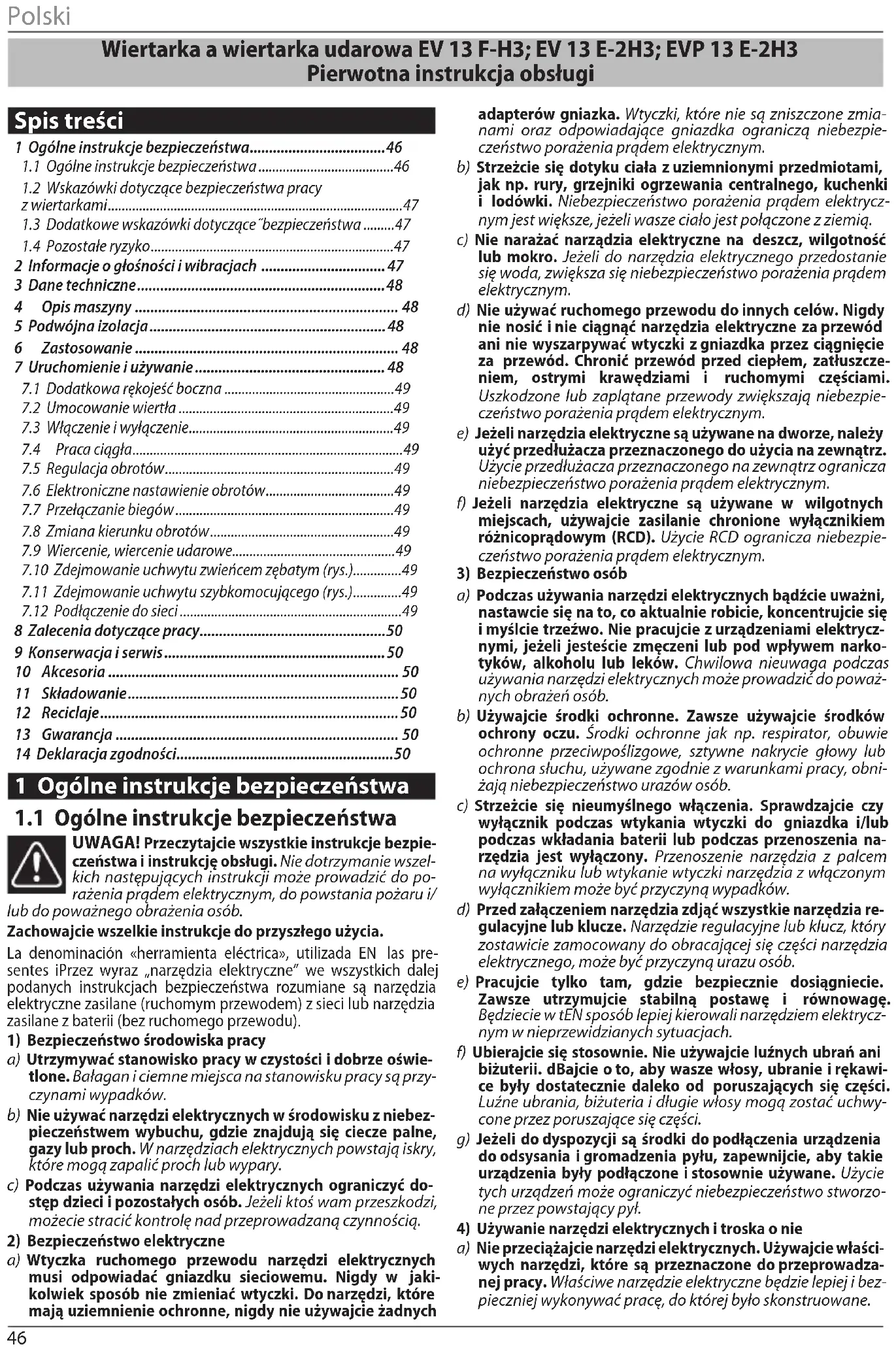 Wiertarka awiertarka udarowa EV13F-H3; EV13E-2H3; EVP13E-2H3 Pierwotna instrukcja obsługi Spis treści 1 Ogólne instrukcje bezpieczeństwa ................................... 46