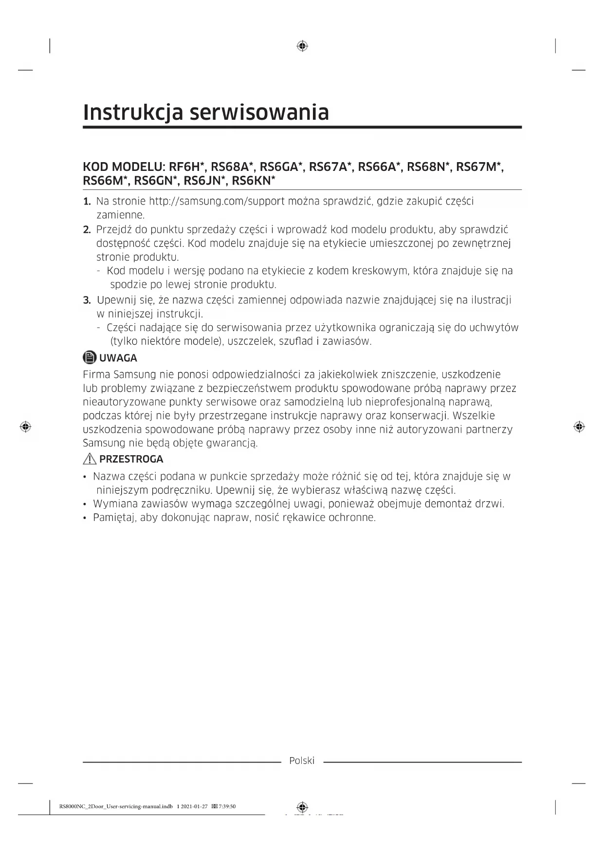 - Pamiętaj, aby dokonując napraw, nosić rękawice ochronne. RS8000NC_2Door_User-servicing-manual.indb 1 2021-01-27 7:39:50Polski Rzeczywisty wygląd i dostarczone elementy urządzenia mogą się różnić w zależności od modelu i kraju.