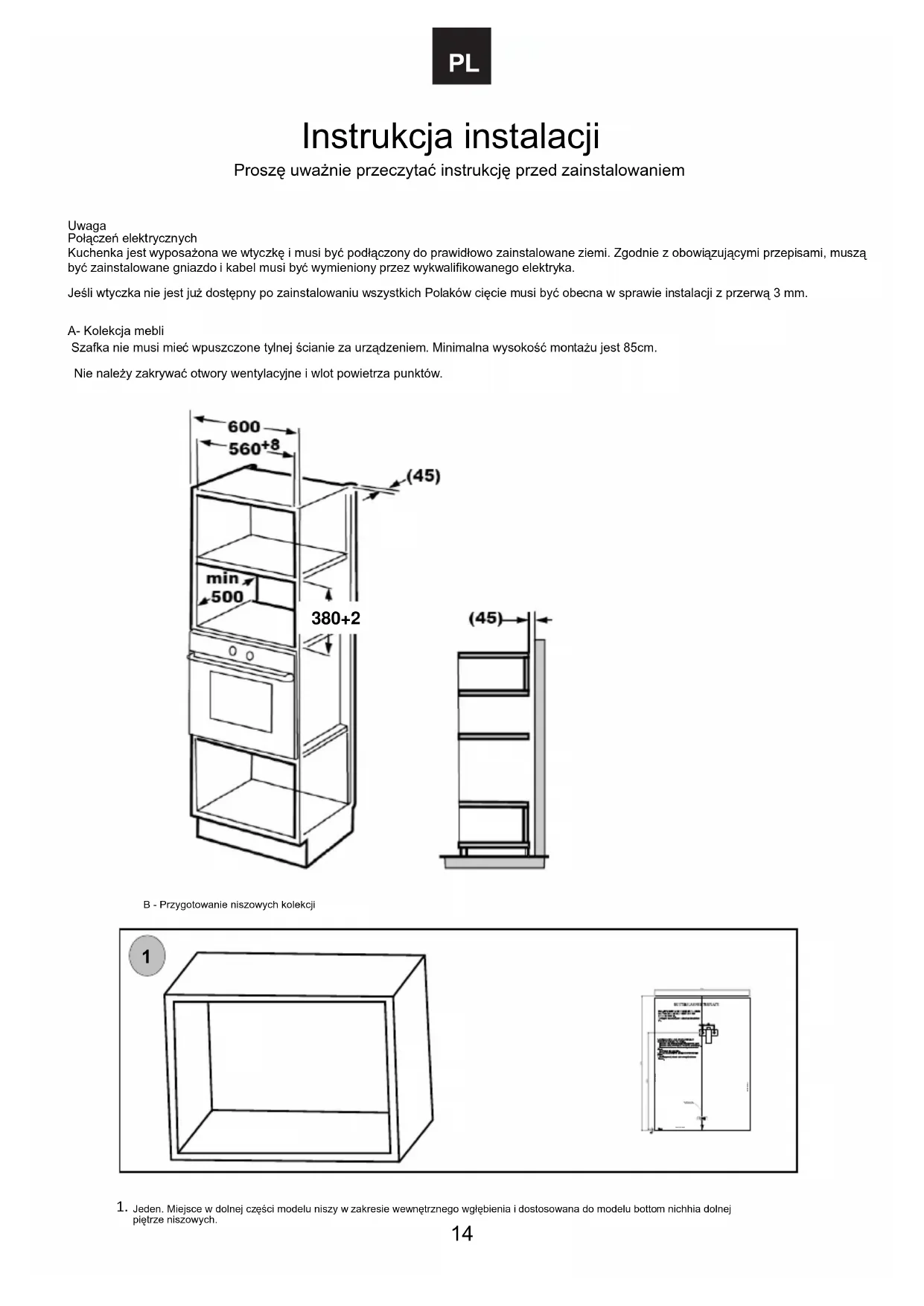 A- Kolekcja mebli Szafka nie musi mieü wpuszczone tylnej Ğcianie za urządzeniem. Minimalna wysokoĞü montaĪu jest 85cm. Nie naleĪy zakrywaü otwory wentylacyjne i wlot powietrza punktów. Instrukcja instalacji ProszĊ uwaĪnie przeczytaü instrukcjĊ przed zainstalowaniem