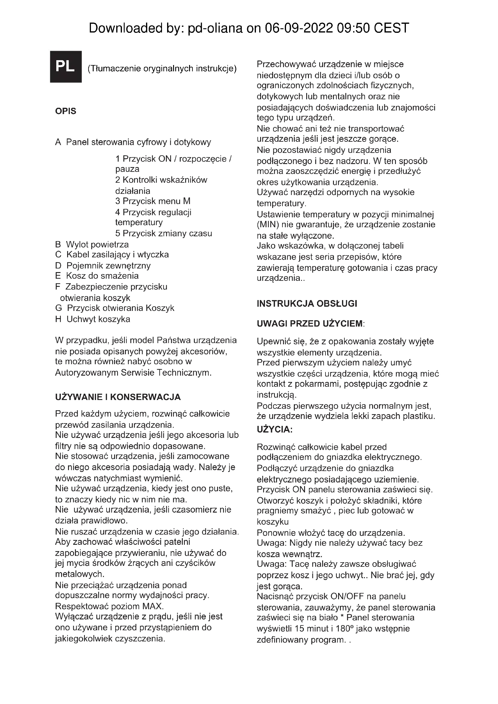 UWAGI PRZED UŻYCIEM: Upewnić się, że z opakowania zostały wyjęte wszystkie elementy urządzenia. Przed pierwszym użyciem należy umyć wszystkie części urządzenia, które mogą mieć kontakt z pokarmami, postępując zgodnie z instrukcją. Podczas pierwszego użycia normalnym jest, że urządzenie wydziela lekki zapach plastiku. UŻYCIA: Rozwinąć całkowicie kabel przed podłączeniem do gniazdka elektrycznego. Podłączyć urządzenie do gniazdka elektrycznego posiadającego uziemienie. Przycisk ON panelu sterowania zaświeci się. Otworzyć koszyk i położyć składniki, które pragniemy smażyć , piec lub gotować w koszyku Ponownie włożyć tacę do urządzenia. Uwaga: Nigdy nie należy używać tacy bez kosza wewnątrz. Uwaga: Tacę należy zawsze obsługiwać poprzez kosz i jego uchwyt.. Nie brać jej, gdy jest gorąca. Nacisnąć przycisk ON/OFF na panelu sterowania, zauważymy, że panel sterowania zaświeci się na biało * Panel sterowania wyświetli 15 minut i 180º jako wstępnie zdeniowany program. . Downloaded by: pd-oliana on 06-09-2022 09:50 CESTTemperatura i czas Można zmienić temperaturę i czaswybierając symbole +/-. Programy wstępnie zdeniowane To urządzenie posiada 9 programów wstępnie zdeniowanych. Aby wybrać program, nacisnąć przycisk z menu będzie można przechodzić z jednego programu do drugiego naciskając.