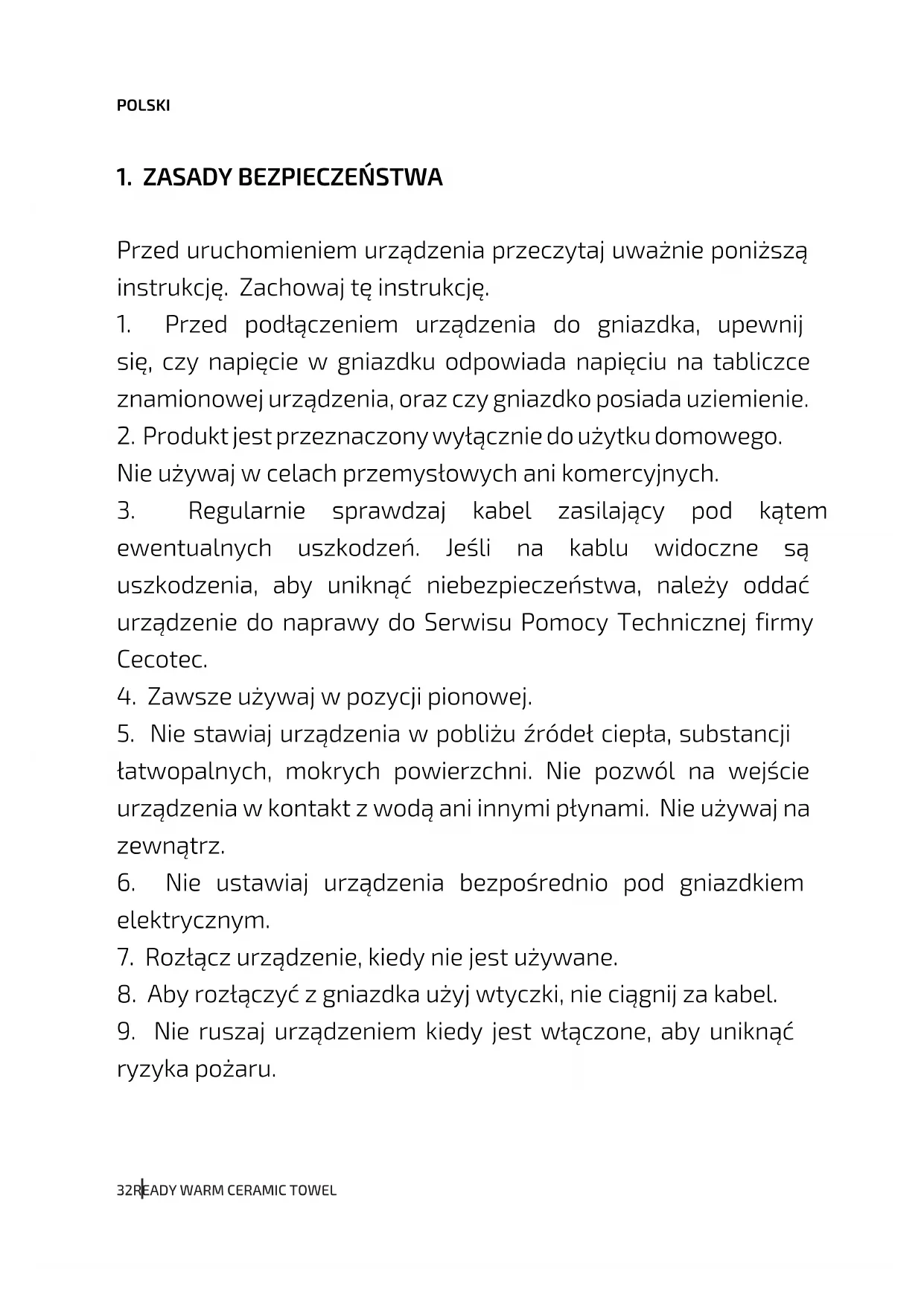 INSTRUKCJA OBSŁUGI Ready Warm 9780 Ceramic Towel CECOTEC