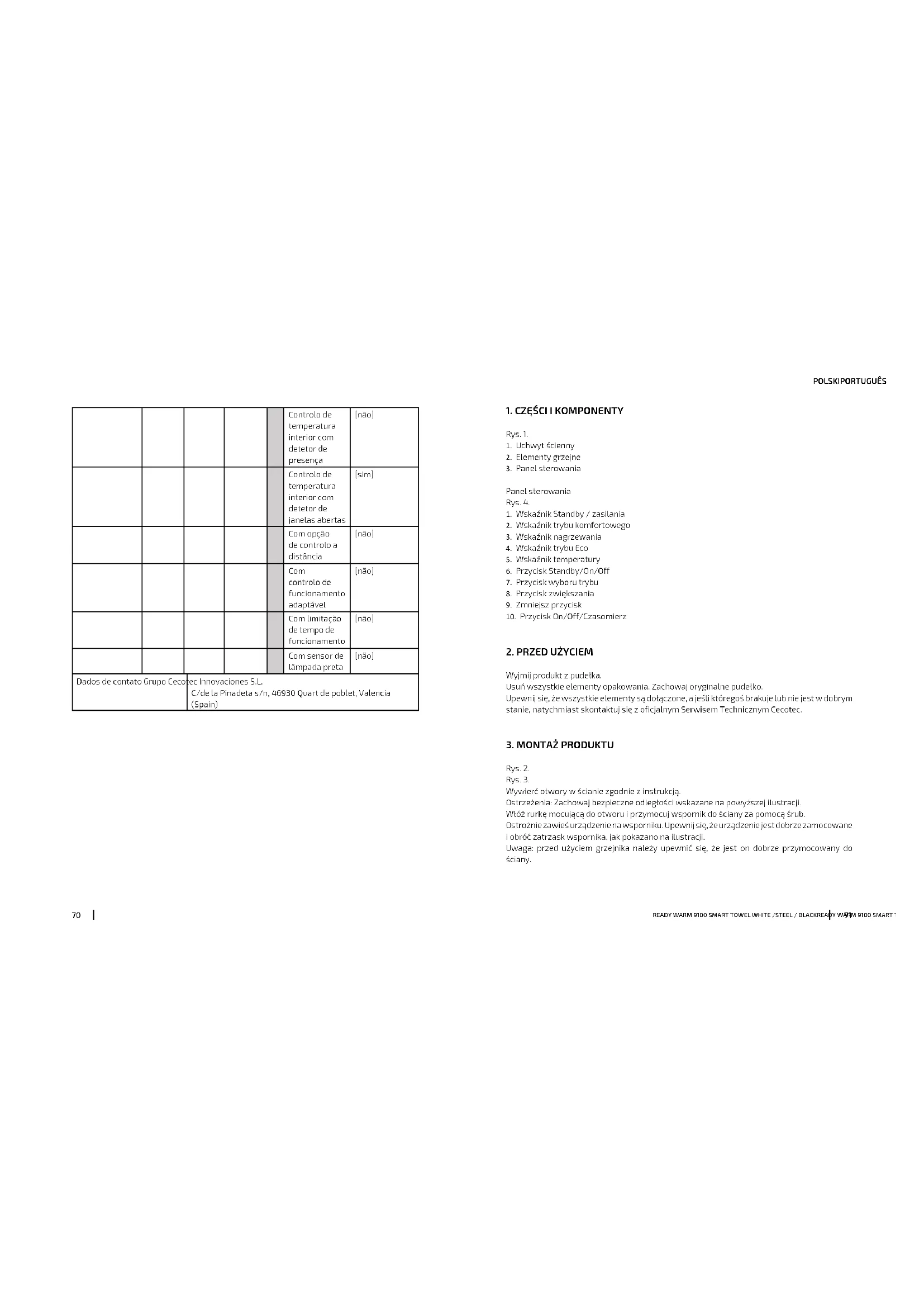 Produkt jest objęty gwarancją przez 2 lata od daty zakupu, o ile faktura zakupu jest przechowywana i wysyłana, produkt jest w idealnym stanie fizycznym i jest używany zgodnie z instrukcją. Gwarancja nie obejmuje: Jeżeli produkt był używany ponad swoje możliwości lub użyteczność, był nadużywany, bity, narażony na wilgoć, zanurzony w jakiejkolwiek cieczy lub żrącej substancji, a także wszelkie inne winy przypisywane konsumentowi. Jeśli produkt został zdemontowany, zmodyfikowany lub naprawiony przez osoby nieupoważnione przez oficjalny SAT firmy Cecotec. Jeżeli występowanie zostało spowodowane normalnym zużyciem części w wyniku użytkowania. Serwis gwarancyjny obejmuje wszystkie wady produkcyjne przez 2 lata, zgodnie z obowiązującymi przepisami, z wyjątkiem części eksploatacyjnych. W przypadku niewłaściwego użycia przez użytkownika serwis gwarancyjny nie będzie odpowiedzialny za naprawę. W przypadku wykrycia incydentu z produktem lub w razie jakichkolwiek pytań prosimy o kontakt z oficjalną pomocą techniczną Cecotec pod numerem telefonu +34 96 321 07 28. Wymagania do spełnienia Modele: 05379_Ready Warm 9100 Smart Towel White 05393 Ready Warm 9100 Smart Towel Steel 05394 Ready Warm 9100 Smart Towel Black Elemnt Symbol Wartość Ilosć Elemnt Ilosć Moc cieplna Rodzaj wkładu ciepła, tylko do akumulacji lokalnych urządzeń elektrycznego ogrzewania (wybierz jedno) Nominalna moc cieplna Pnom 0.5 KW Ręczna kontrola obciążenia cieplnego, ze zintegrowanym termostatem Nie dotyczy Minimalna moc cieplna (orientacyjna)