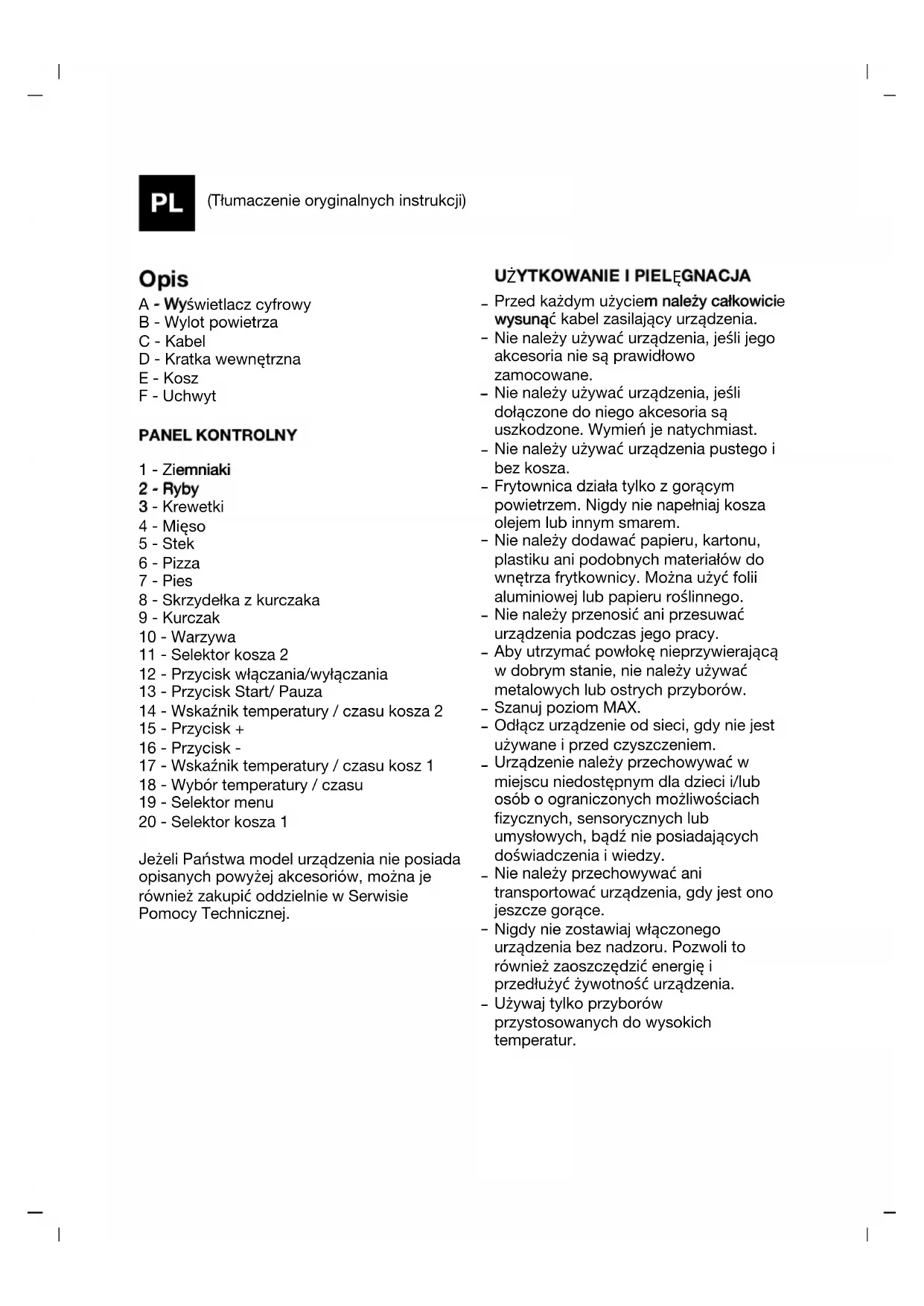 Przed każdym użyciem należy całkowicie wysunąć kabel zasilający urządzenia. Nie należy używać urządzenia, jeśli jego akcesoria nie są prawidłowo zamocowane. Nie należy używać urządzenia, jeśli dołączone do niego akcesoria są uszkodzone. Wymień je natychmiast. Nie należy używać urządzenia pustego i bez kosza. Frytownica działa tylko z gorącym powietrzem. Nigdy nie napełniaj kosza olejem lub innym smarem. Nie należy dodawać papieru, kartonu, plastiku ani podobnych materiałów do wnętrza frytkownicy. Można użyć folii aluminiowej lub papieru roślinnego. Nie należy przenosić ani przesuwać urządzenia podczas jego pracy. Aby utrzymać powłokę nieprzywierającą w dobrym stanie, nie należy używać metalowych lub ostrych przyborów. Szanuj poziom MAX. Odłącz urządzenie od sieci, gdy nie jest używane i przed czyszczeniem. Urządzenie należy przechowywać w miejscu niedostępnym dla dzieci i/lub osób o ograniczonych możliwościach fizycznych, sensorycznych lub umysłowych, bądź nie posiadających doświadczenia i wiedzy. Nie należy przechowywać ani transportować urządzenia, gdy jest ono jeszcze gorące. Nigdy nie zostawiaj włączonego urządzenia bez nadzoru. Pozwoli to również zaoszczędzić energię i przedłużyć żywotność urządzenia. Używaj tylko przyborów przystosowanych do wysokich temperatur.