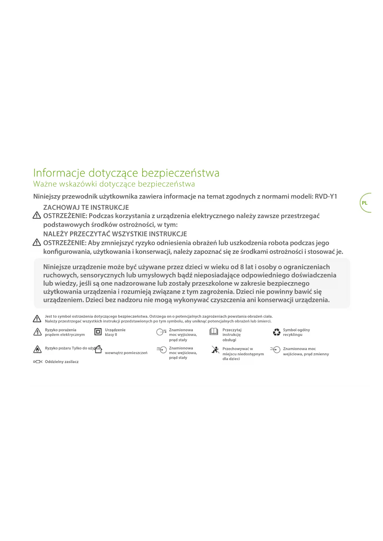Ryzyko porażenia prądem elektrycznym Urządzenie klasy II Przeczytaj instrukcję obsługi Ryzyko pożaru Tylko do użytku wewnątrz pomieszczeń Przechowywać w miejscu niedostępnym dla dzieci Symbol ogólny recyklingu Znamionowa moc wejściowa, prąd stały Znamionowa moc wyjściowa, prąd stały Oddzielny zasilacz Niniejszy przewodnik użytkownika zawiera informacje na temat zgodnych z normami modeli: RVD-Y1 Znamionowa moc wejściowa, prąd zmiennyPL PRZESTROGA