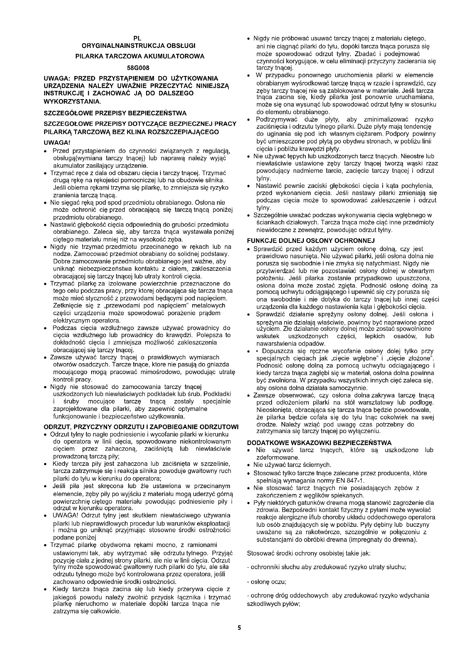 - Nigdy nie wolno cofać pilarki z wirującą tarczą tnącą, gdyż grozi to zaistnieniem zjawiska odrzutu tylnego.