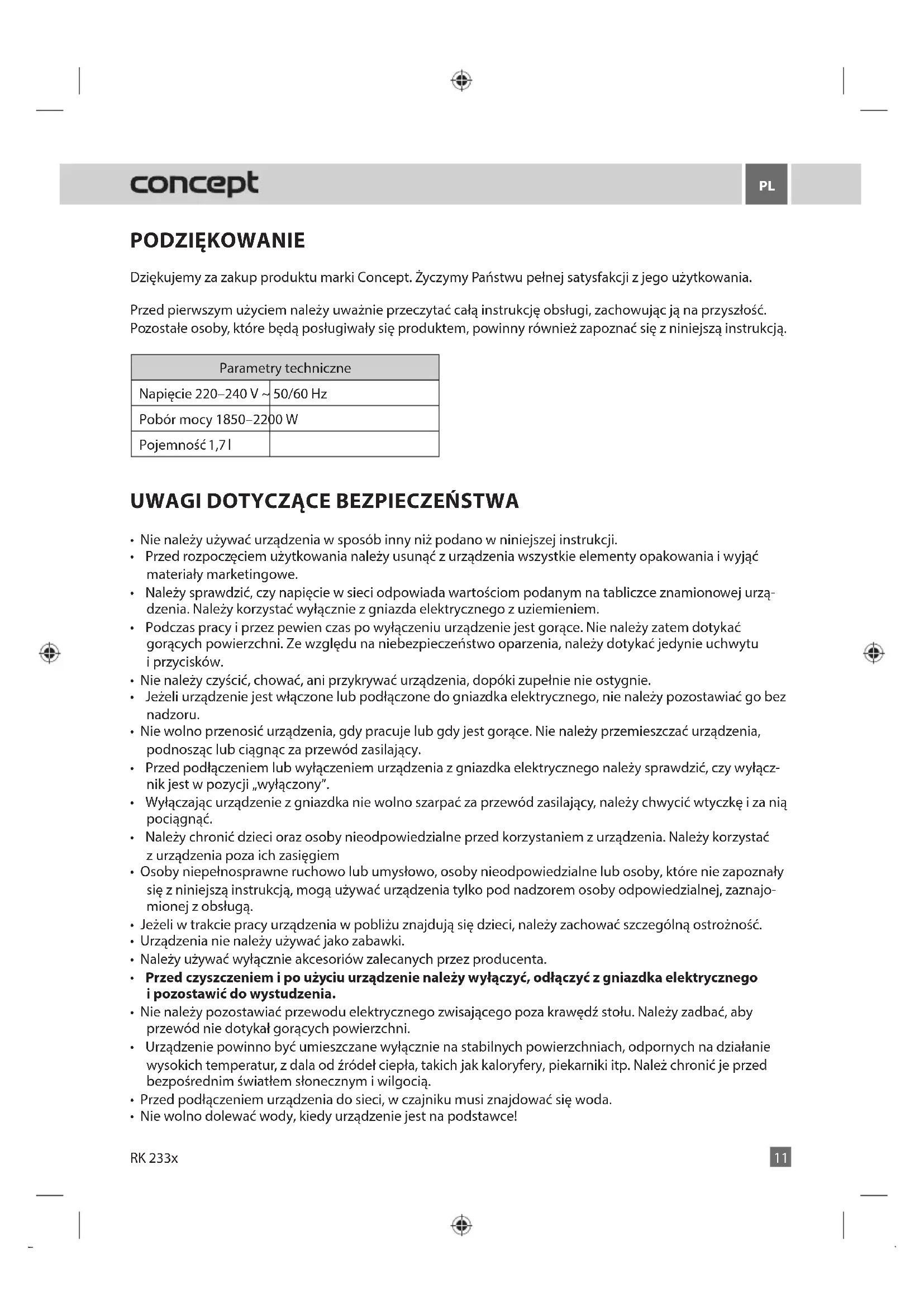 PODZIĘKOWANIE Dziękujemy za zakup produktu marki Concept. Życzymy Państwu pełnej satysfakcji z jego użytkowania. Przed pierwszym użyciem należy uważnie przeczytać całą instrukcję obsługi, zachowując ją na przyszłość. Pozostałe osoby, które będą posługiwały się produktem, powinny również zapoznać się z niniejszą instrukcją. Parametry techniczne Napięcie 220–240 V ~ 50/60 Hz Pobór mocy 1850–2200 W Pojemność 1,7 l