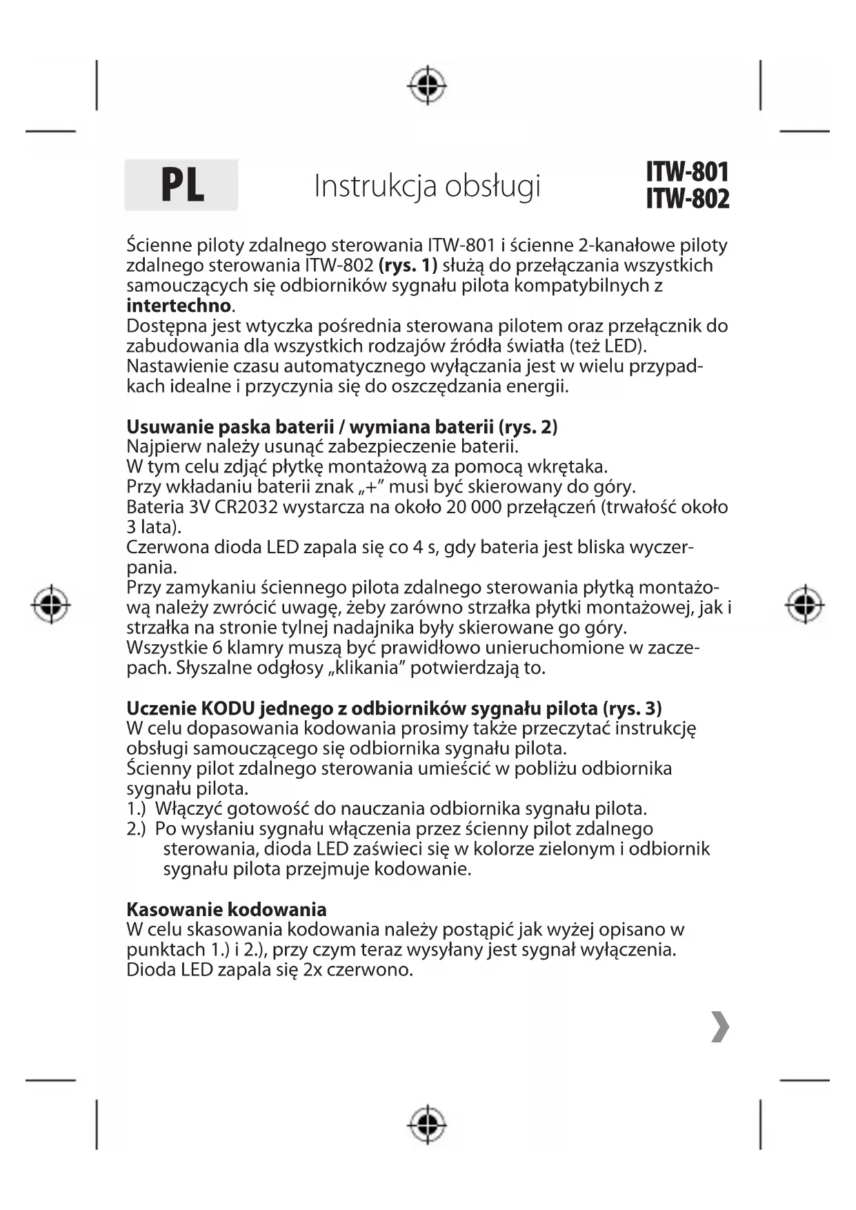 ITW-801 ITW-802Ścienne piloty zdalnego sterowania ITW-801 i ścienne 2-kanałowe piloty zdalnego sterowania ITW-802 (rys. 1) służą do przełączania wszystkich samouczących się odbiorników sygnału pilota kompatybilnych z intertechno. Dostępna jest wtyczka pośrednia sterowana pilotem oraz przełącznik do zabudowania dla wszystkich rodzajów źródła światła (też LED). Nastawienie czasu automatycznego wyłączania jest w wielu przypad- kach idealne i przyczynia się do oszczędzania energii. Usuwanie paska baterii / wymiana baterii (rys. 2) Najpierw należy usunąć zabezpieczenie baterii. W tym celu zdjąć płytkę montażową za pomocą wkrętaka. Przy wkładaniu baterii znak „+” musi być skierowany do góry. Bateria 3V CR2032 wystarcza na około 20 000 przełączeń (trwałość około 3 lata). Czerwona dioda LED zapala się co 4 s, gdy bateria jest bliska wyczer- pania. Przy zamykaniu ściennego pilota zdalnego sterowania płytką montażo- wą należy zwrócić uwagę, żeby zarówno strzałka płytki montażowej, jak i strzałka na stronie tylnej nadajnika były skierowane go góry. Wszystkie 6 klamry muszą być prawidłowo unieruchomione w zacze- pach. Słyszalne odgłosy „klikania” potwierdzają to. Uczenie KODU jednego z odbiorników sygnału pilota (rys. 3) W celu dopasowania kodowania prosimy także przeczytać instrukcję obsługi samouczącego się odbiornika sygnału pilota. Ścienny pilot zdalnego sterowania umieścić w pobliżu odbiornika sygnału pilota. 1.) Włączyć gotowość do nauczania odbiornika sygnału pilota. 2.) Po wysłaniu sygnału włączenia przez ścienny pilot zdalnego sterowania, dioda LED zaświeci się w kolorze zielonym i odbiornik sygnału pilota przejmuje kodowanie. Kasowanie kodowania W celu skasowania kodowania należy postąpić jak wyżej opisano w punktach 1.) i 2.), przy czym teraz wysyłany jest sygnał wyłączenia. Dioda LED zapala się 2x czerwono. Instrukcja obsługi
