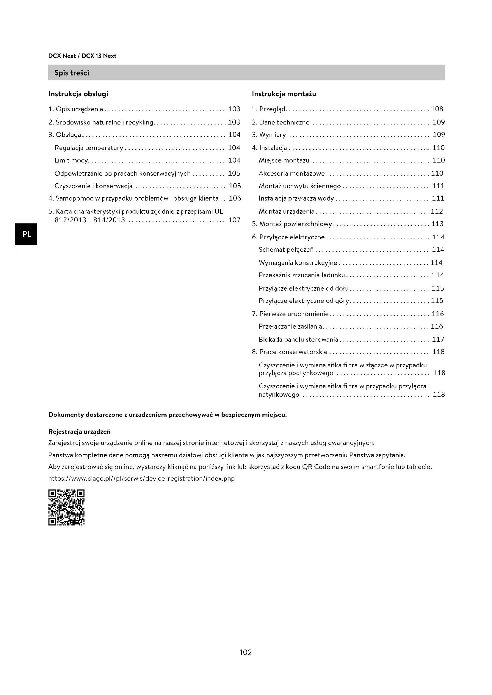 Spis treści Dokumenty dostarczone z urządzeniem przechowywać w bezpiecznym miejscu. Rejestracja urządzeń Zarejestruj swoje urządzenie online na naszej stronie internetowej i skorzystaj z naszych usług gwarancyjnych. Państwa kompletne dane pomogą naszemu działowi obsługi klienta w jak najszybszym przetworzeniu Państwa zapytania. Aby zarejestrować się online, wystarczy kliknąć na poniższy link lub skorzystać z kodu QR Code na swoim smartfonie lub tablecie. https://www.clage.pl//pl/serwis/device-registration/index.php Instrukcja obsługi . Opis urządzenia .................................... . Środowisko naturalne i recykling ...................... . Obsługa ........................................... Regulacja temperatury .............................. Limit mocy. . . . . . . . . . . . . . . . . . . . . . . . . . . . . . . . . . . . . . . . . Odpowietrzanie po pracach konserwacyjnych .......... Czyszczenie i konserwacja ........................... . Samopomoc w przypadku problemów i obsługa klienta .. . Karta charakterystyki produktu zgodnie z przepisami UE - / / ............................. Instrukcja montażu . Przegląd ........................................... . Dane techniczne ................................... . Wymiary .......................................... . Instalacja .......................................... Miejsce montażu ................................... Akcesoria montażowe ............................... Montaż uchwytu ściennego .......................... Instalacja przyłącza wody ............................ Montaż urządzenia .................................. . Montaż powierzchniowy ............................. . Przyłącze elektryczne ............................... Schemat połączeń .................................. Wymagania konstrukcyjne ........................... Przekaźnik zrzucania ładunku ......................... Przyłącze elektryczne od dołu ........................ Przyłącze elektryczne od góry ........................ . Pierwsze uruchomienie .............................. Przełączanie zasilania ................................ Blokada panelu sterowania ........................... . Prace konserwatorskie .............................. Czyszczenie i wymiana sitka filtra w złączce w przypadku przyłącza podtynkowego ............................ Czyszczenie i wymiana sitka filtra w przypadku przyłącza natynkowego ...................................... CLAGE