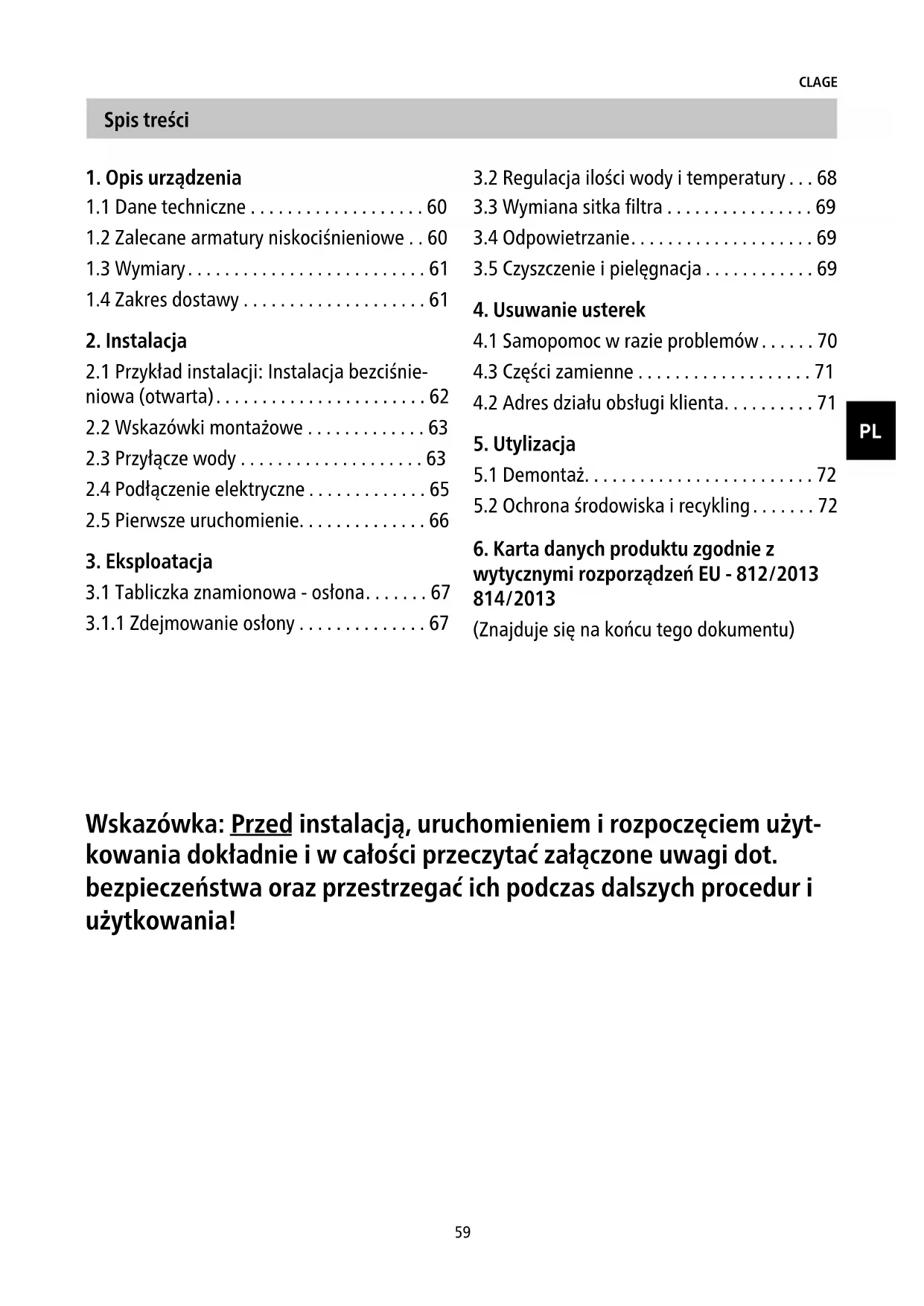 - Dla uzyskania prawidłowego dostarczania wody należy regularnie odkręcać i czyścić arma- turę (regulatory strumienia i główki prysznicowe). Celem zagwarantowania w każdym momencie prawidłowego działania oraz bezpieczeństwa pracy urządzenia, co trzy lata należy zlecać przegląd części elektrycznych i hydraulicznych uznanemu specjalistycznemu zakładowi. Eksploatacja