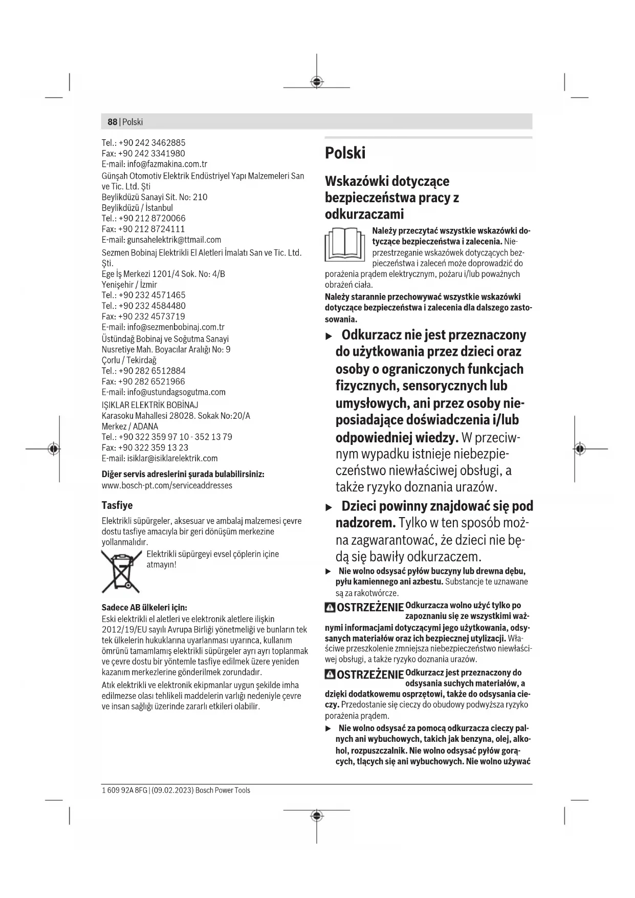 Karasoku Mahallesi 28028. Sokak No:20/A Merkez / ADANA Tel.: +903223599710 -3521379 Fax: +903223591323 E-mail: isiklar@isiklarelektrik.com Diğer servis adreslerini şurada bulabilirsiniz: www.bosch-pt.com/serviceaddresses Tasfiye Elektrikli süpürgeler, aksesuar ve ambalaj malzemesi çevre dostu tasfiye amacıyla bir geri dönüşüm merkezine yollanmalıdır. Elektrikli süpürgeyi evsel çöplerin içine atmayın! Sadece AB ülkeleri için: Eski elektrikli el aletleri ve elektronik aletlere ilişkin 2012/19/EU sayılı Avrupa Birliği yönetmeliği ve bunların tek tek ülkelerin hukuklarına uyarlanması uyarınca, kullanım ömrünü tamamlamış elektrikli süpürgeler ayrı ayrı toplanmak ve çevre dostu bir yöntemle tasfiye edilmek üzere yeniden kazanım merkezlerine gönderilmek zorundadır. Atık elektrikli ve elektronik ekipmanlar uygun şekilde imha edilmezse olası tehlikeli maddelerin varlığı nedeniyle çevre ve insan sağlığı üzerinde zararlı etkileri olabilir. Polski Wskazówki dotyczące bezpieczeństwa pracy z odkurzaczami Należy przeczytać wszystkie wskazówki do- tyczące bezpieczeństwa i zalecenia. Nie- przestrzeganie wskazówek dotyczących bez- pieczeństwa izaleceń może doprowadzić do porażenia prądem elektrycznym, pożaru i/lub poważnych obrażeń ciała. Należy starannie przechowywać wszystkie wskazówki dotyczące bezpieczeństwa i zalecenia dla dalszego zasto- sowania. u Odkurzacz nie jest przeznaczony do użytkowania przez dzieci oraz osoby o ograniczonych funkcjach fizycznych, sensorycznych lub umysłowych, ani przez osoby nie- posiadające doświadczenia i/lub odpowiedniej wiedzy. W przeciw- nym wypadku istnieje niebezpie- czeństwo niewłaściwej obsługi, a także ryzyko doznania urazów. u Dzieci powinny znajdować się pod nadzorem. Tylko w ten sposób moż- na zagwarantować, że dzieci nie bę- dą się bawiły odkurzaczem. u Nie wolno odsysać pyłów buczyny lub drewna dębu, pyłu kamiennego ani azbestu. Substancje te uznawane są za rakotwórcze. OSTRZEŻENIE Odkurzacza wolno użyć tylko po zapoznaniu się ze wszystkimi waż- nymi informacjami dotyczącymi jego użytkowania, odsy- sanych materiałów oraz ich bezpiecznej utylizacji. Wła- ściwe przeszkolenie zmniejsza niebezpieczeństwo niewłaści- wej obsługi, a także ryzyko doznania urazów. OSTRZEŻENIE Odkurzacz jest przeznaczony do odsysania suchych materiałów, a dzięki dodatkowemu osprzętowi, także do odsysania cie- czy. Przedostanie się cieczy do obudowy podwyższa ryzyko porażenia prądem. u Nie wolno odsysać za pomocą odkurzacza cieczy pal- nych ani wybuchowych, takich jak benzyna, olej, alko- hol, rozpuszczalnik. Nie wolno odsysać pyłów gorą- cych, tlących się ani wybuchowych. Nie wolno używać 1 609 92A 8FG | (09.02.2023) Bosch Power ToolsPolski | 89 odkurzacza w pomieszczeniach zagrożonych wybu- chem. Pyły, opary lub ciecze mogą się zapalić lub wy- buchnąć. OSTRZEŻENIE Gniazda sieciowego należy używać wyłącznie do celów określonych w instrukcji obsługi. OSTRZEŻENIE Po zauważeniu wycieku wody lub piany, odkurzacz należy natych- miast wyłączyć i opróżnić zbiornik. W przeciwnym wypad- ku może dojść do uszkodzenia odkurzacza u UWAGA! Odkurzacz musi być używany i przechowy- wany wyłącznie w pomieszczeniach zamknię- tych.Przedostanie się wody lub wilgoci do górnej części odkurzacza zwiększa ryzyko porażenia prądem elektrycz- nym. u UWAGA! Pływak należy regularnie czyścić i spraw- dzać, czy nie jest on uszkodzony. W przeciwnym wy- padku może dojść do zakłóceń jego działania. u Jeżeli nie da się uniknąć zastosowania odkurzacza w wilgotnym otoczeniu, należy użyć wyłącznika ochron- nego różnicowoprądowego. Zastosowanie wyłącznika ochronnego różnicowoprądowego zmniejsza ryzyko pora- żenia prądem. u Przed każdym zastosowaniem urządzenia należy skon- trolować odkurzacz, jego przewód i wtyczkę. W razie stwierdzenia uszkodzeń nie wolno użytkować odku- rzacza. Nie wolno samodzielnie otwierać odkurzacza, a jego naprawę należy zlecać jedynie wykwalifikowa- nym fachowcom i wykonać ją tylko przy użyciu orygi- nalnych części zamiennych. Uszkodzone odkurzacze, przewody i wtyczki zwiększają ryzyko porażenia prądem elektrycznym. u Nie wolno najeżdżać na przewód, zginać go lub zgnia- tać. Nie wolno ciągnąć za przewód, aby wyjąć wtyczkę z gniazda lub przesunąć odkurzacz z miejsca na miej- sce. Uszkodzone przewody zwiększają ryzyko porażenia prądem. u Przed przystąpieniem do zmiany nastaw, wymianą osprzętu lub przed odłożeniem odkurzacza, należy wy- jąć wtyczkę z gniazda sieciowego. Ten środek ostrożno- ści zapobiega niezamierzonemu włączeniu się odkurza- cza. u Należy zawsze dbać o dobrą wentylację stanowiska pracy. u Naprawę odkurzacza należy zlecać jedynie wykwalifi- kowanym fachowcom i wykonać ją tylko przy użyciu oryginalnych części zamiennych. Tylko w ten sposób można zagwarantować zachowanie bezpieczeństwa odku- rzacza. OSTRZEŻENIE Odkurzacz zawiera pył niebez- pieczny dla zdrowia. Prace związa- ne z opróżnianiem i konserwacją, w tym utylizację pojem- ników na pył, należy zlecać jedynie wykwalifikowanym fachowcom. Podczas pracy konieczne jest stosowanie odpowiednich środków ochrony. Nie wolno używać odku- rzacza bez kompletnego i prawidłowo stosowanego sys- temu filtracji. Użycie takie jest groźne dla zdrowia. u Przed uruchomieniem urządzenia należy skontrolo- wać stan techniczny węża. Wąż należy przedtem za- mocować do odkurzacza, aby nie nastąpiło niezamie- rzone wyrzucenie pyłu na zewnątrz. Mogło by wówczas dojść do przedostania się pyłu do dróg oddechowych. u Nie wolno siadać na odkurzaczu. Może to spowodować uszkodzenie odkurzacza. u Należy ostrożnie obchodzić się z przewodem siecio- wym i wężem. Mogą one stanowić zagrożenie dla innych osób. u Odkurzacza nie wolno cz
