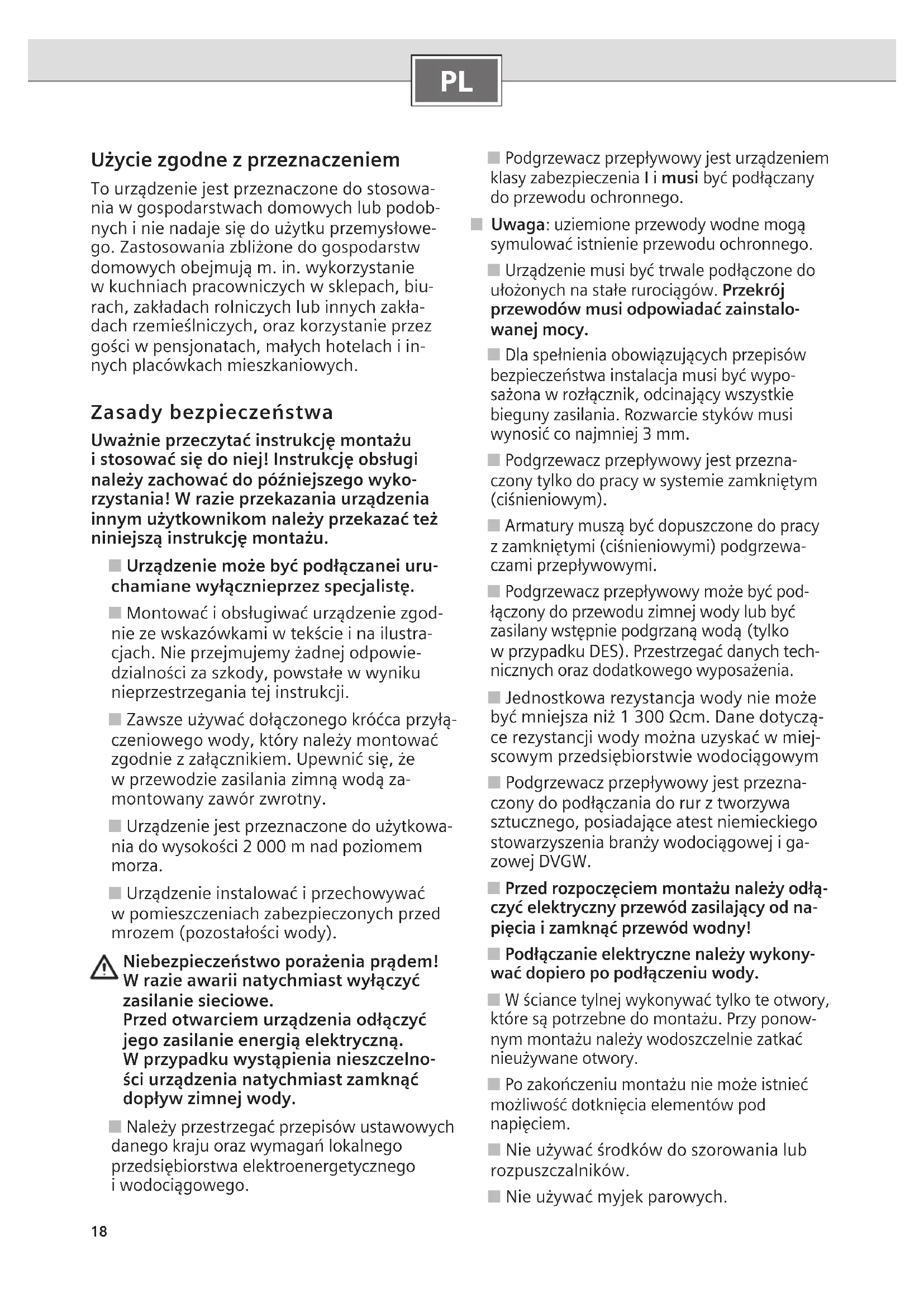 Użycie zgodne z przeznaczeniem To urządzenie jest przeznaczone do stosowa- nia w gospodarstwach domowych lub podob- nych i nie nadaje się do użytku przemysłowe- go. Zastosowania zbliżone do gospodarstw domowych obejmują m. in. wykorzystanie w kuchniach pracowniczych w sklepach, biu- rach, zakładach rolniczych lub innych zakła- dach rzemieślniczych, oraz korzystanie przez gości w pensjonatach, małych hotelach i in- nych placówkach mieszkaniowych. Zasady bezpieczeństwa Uważnie przeczytać instrukcję montażu i stosować się do niej! Instrukcję obsługi należy zachować do późniejszego wyko- rzystania! W razie przekazania urządzenia innym użytkownikom należy przekazać też niniejszą instrukcję montażu. ■ Urządzenie może być podłączanei uru- chamiane wyłącznieprzez specjalistę. ■ Montować i obsługiwać urządzenie zgod- nie ze wskazówkami w tekście i na ilustra- cjach. Nie przejmujemy żadnej odpowie- dzialności za szkody, powstałe w wyniku nieprzestrzegania tej instrukcji. ■ Zawsze używać dołączonego króćca przyłą- czeniowego wody, który należy montować zgodnie z załącznikiem. Upewnić się, że w przewodzie zasilania zimną wodą za- montowany zawór zwrotny. ■ Urządzenie jest przeznaczone do użytkowa- nia do wysokości 2 000 m nad poziomem morza. ■ Urządzenie instalować i przechowywać w pomieszczeniach zabezpieczonych przed mrozem (pozostałości wody). Niebezpieczeństwo porażenia prądem! W razie awarii natychmiast wyłączyć zasilanie sieciowe. Przed otwarciem urządzenia odłączyć jego zasilanie energią elektryczną. W przypadku wystąpienia nieszczelno- ści urządzenia natychmiast zamknąć dopływ zimnej wody. ■ Należy przestrzegać przepisów ustawowych danego kraju oraz wymagań lokalnego przedsiębiorstwa elektroenergetycznego i wodociągowego. ■ Podgrzewacz przepływowy jest urządzeniem klasy zabezpieczenia I i musi być podłączany do przewodu ochronnego. ■ Uwaga: uziemione przewody wodne mogą symulować istnienie przewodu ochronnego. ■ Urządzenie musi być trwale podłączone do ułożonych na stałe rurociągów. Przekrój przewodów musi odpowiadać zainstalo- wanej mocy. ■ Dla spełnienia obowiązujących przepisów bezpieczeństwa instalacja musi być wypo- sażona w rozłącznik, odcinający wszystkie bieguny zasilania. Rozwarcie styków musi wynosić co najmniej 3 mm. ■ Podgrzewacz przepływowy jest przezna- czony tylko do pracy w systemie zamkniętym (ciśnieniowym). ■ Armatury muszą być dopuszczone do pracy z zamkniętymi (ciśnieniowymi) podgrzewa- czami przepływowymi. ■ Podgrzewacz przepływowy może być pod- łączony do przewodu zimnej wody lub być zasilany wstępnie podgrzaną wodą (tylko w przypadku DES) . Przestrzegać danych tech- nicznych oraz dodatkowego wyposażenia. ■ Jednostkowa rezystancja wody nie może być mniejsza niż 1 300 Ωcm. Dane dotyczą- ce rezystancji wody można uzyskać w miej- scowym przedsiębiorstwie wodociągowym ■ Podgrzewacz przepływowy jest przezna- czony do podłączania do rur z tworzywa sztucznego, posiadające atest niemieckiego stowarzyszenia branży wodociągowej i ga- zowej DVGW. ■ Przed rozpoczęciem montażu należy odłą- czyć elektryczny przewód zasilający od na- pięcia i zamknąć przewód wodny! ■ Podłączanie elektryczne należy wykony- wać dopiero po podłączeniu wody. ■ W ściance tylnej wykonywać tylko te otwory, które są potrzebne do montażu. Przy ponow- nym montażu należy wodoszczelnie zatkać nieużywane otwory. ■ Po zakończeniu montażu nie może istnieć możliwość dotknięcia elementów pod napięciem. ■ Nie używać środków do szorowania lub rozpuszczalników. ■ Nie używać myjek parowych.19
