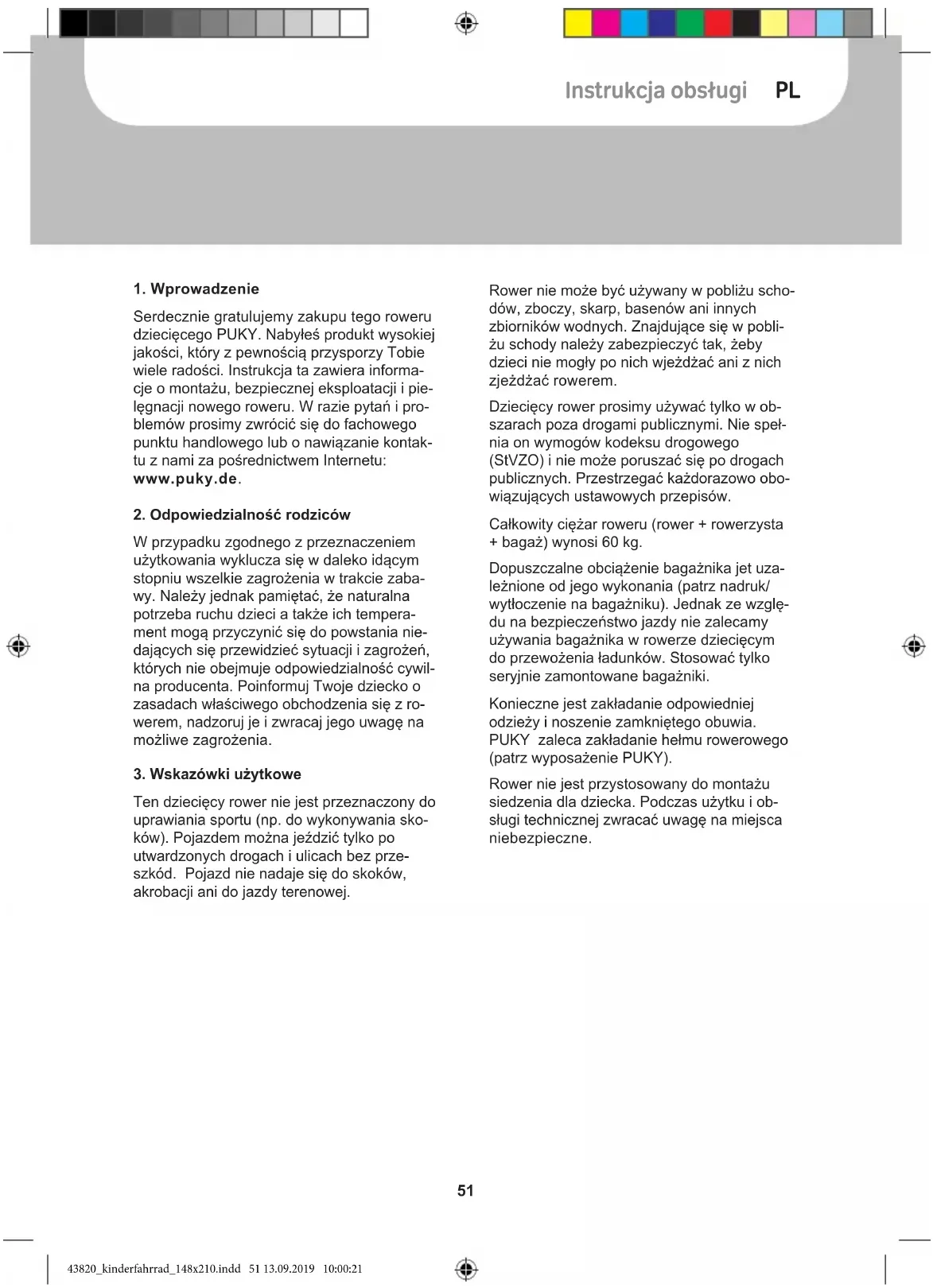 Serdecznie gratulujemy zakupu tego roweru dziecięcego PUKY. Nabyłeś produkt wysokiej jakości, który z pewnością przysporzy Tobie wiele radości. Instrukcja ta zawiera informa- cje o montażu, bezpiecznej eksploatacji i pie- lęgnacji nowego roweru. W razie pytań i pro- blemów prosimy zwrócić się do fachowego punktu handlowego lub o nawiązanie kontak- tu z nami za pośrednictwem Internetu: www.puky.de.