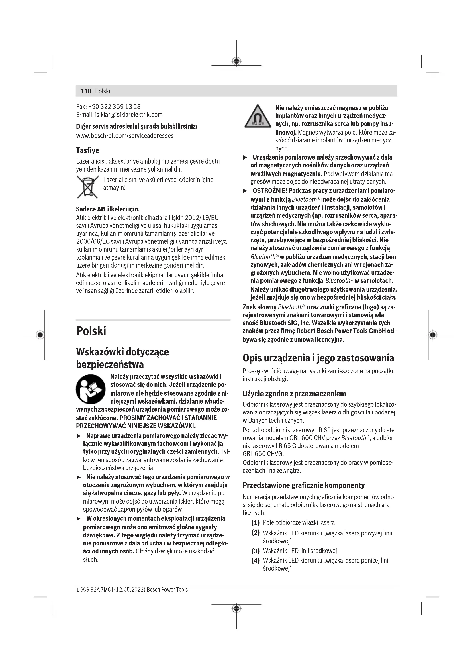 Karasoku Mahallesi 28028. Sokak No:20/A Merkez / ADANA Tel.: +903223599710 -3521379 Bosch Power Tools 1 609 92A 7M6 | (12.05.2022)110 | Polski Fax: +903223591323 E-mail: isiklar@isiklarelektrik.com Diğer servis adreslerini şurada bulabilirsiniz: www.bosch-pt.com/serviceaddresses Tasfiye Lazer alıcısı, aksesuar ve ambalaj malzemesi çevre dostu yeniden kazanım merkezine yollanmalıdır. Lazer alıcısını ve aküleri evsel çöplerin içine atmayın! Sadece AB ülkeleri için: Atık elektrikli ve elektronik cihazlara ilişkin 2012/19/EU sayılı Avrupa yönetmeliği ve ulusal hukuktaki uygulaması uyarınca, kullanım ömrünü tamamlamış lazer alıcılar ve 2006/66/EC sayılı Avrupa yönetmeliği uyarınca arızalı veya kullanım ömrünü tamamlamış aküler/piller ayrı ayrı toplanmalı ve çevre kurallarına uygun şekilde imha edilmek üzere bir geri dönüşüm merkezine gönderilmelidir. Atık elektrikli ve elektronik ekipmanlar uygun şekilde imha edilmezse olası tehlikeli maddelerin varlığı nedeniyle çevre ve insan sağlığı üzerinde zararlı etkileri olabilir. Polski Wskazówki dotyczące bezpieczeństwa Należy przeczytać wszystkie wskazówki i stosować się do nich. Jeżeli urządzenie po- miarowe nie będzie stosowane zgodnie z ni- niejszymi wskazówkami, działanie wbudo- wanych zabezpieczeń urządzenia pomiarowego może zo- stać zakłócone. PROSIMY ZACHOWAĆ I STARANNIE PRZECHOWYWAĆ NINIEJSZE WSKAZÓWKI. u Naprawę urządzenia pomiarowego należy zlecać wy- łącznie wykwalifikowanym fachowcom i wykonać ją tylko przy użyciu oryginalnych części zamiennych. Tyl- ko w ten sposób zagwarantowane zostanie zachowanie bezpieczeństwa urządzenia. u Nie należy stosować tego urządzenia pomiarowego w otoczeniu zagrożonym wybuchem, wktórym znajdują się łatwopalne ciecze, gazy lub pyły. W urządzeniu po- miarowym może dojść do utworzenia iskier, które mogą spowodować zapłon pyłów lub oparów. u W określonych momentach eksploatacji urządzenia pomiarowego może ono emitować głośne sygnały dźwiękowe. Z tego względu należy trzymać urządze- nie pomiarowe z dala od ucha i w bezpiecznej odległo- ści od innych osób. Głośny dźwięk może uszkodzić słuch. Nie należy umieszczać magnesu w pobliżu implantów oraz innych urządzeń medycz- nych, np. rozrusznika serca lub pompy insu- linowej. Magneswytwarza pole, które może za- kłócić działanie implantów i urządzeń medycz- nych. u Urządzenie pomiarowe należy przechowywać z dala od magnetycznych nośników danych oraz urządzeń wrażliwych magnetycznie. Pod wpływem działania ma- gnesów może dojść do nieodwracalnej utraty danych. u OSTROŻNIE! Podczas pracy z urządzeniami pomiaro- wymi z funkcją Bluetooth® może dojść do zakłócenia działania innych urządzeń i instalacji, samolotów i urządzeń medycznych (np. rozruszników serca, apara- tów słuchowych. Nie można także całkowicie wyklu- czyć potencjalnie szkodliwego wpływu na ludzi i zwie- rzęta, przebywające w bezpośredniej bliskości. Nie należy stosować urządzenia pomiarowego z funkcją Bluetooth® w pobliżu urządzeń medycznych, stacji ben- zynowych, zakładów chemicznych ani w rejonach za- grożonych wybuchem. Nie wolno użytkować urządze- nia pomiarowego z funkcją Bluetooth® w samolotach. Należy unikać długotrwałego użytkowania urządzenia, jeżeli znajduje się ono w bezpośredniej bliskości ciała. Znak słowny Bluetooth® oraz znaki graficzne (logo) są za- rejestrowanymi znakami towarowymi i stanowią wła- sność Bluetooth SIG, Inc. Wszelkie wykorzystanie tych znaków przez firmę Robert Bosch Power Tools GmbH od- bywa się zgodnie z umową licencyjną. Opis urządzenia i jego zastosowania Proszę zwrócić uwagę na rysunki zamieszczone na początku instrukcji obsługi. Użycie zgodne z przeznaczeniem Odbiornik laserowy jest przeznaczony do szybkiego lokalizo- wania obracających się wiązek lasera o długości fali podanej w Danych technicznych. Ponadto odbiornik laserowy LR60 jest przeznaczony do ste- rowania modelem GRL600CHV przez Bluetooth®, a odbior- nik laserowy LR65G do sterowania modelem GRL650CHVG. Odbiornik laserowy jest przeznaczony do pracy w pomiesz- czeniach i na zewnątrz. Przedstawione graficznie komponenty Numeracja przedstawionych graficznie komponentów odno- si się do schematu odbiornika laserowego na stronach gra- ficznych. (1) Pole odbiorcze wiązki lasera (2) Wskaźnik LED kierunku „wiązka lasera powyżej linii środkowej” (3) Wskaźnik LED linii środkowej (4) Wskaźnik LED kierunku „wiązka lasera poniżej linii środkowej” 1 609 92A 7M6 | (12.05.2022) Bosch Power ToolsPolski | 111 (5) Wyświetlacz (przednia i tylna strona) (6) Głośnik (7) Libella (8) Hak do zawieszenia (9) Znacznik środka (10) Magnesy (11) Gniazdo mocowania uchwytu (12) Numer seryjny (13) Pokrywka wnęki na baterie (14) Blokada pokrywki wnęki na baterie (15) Przycisk osi Y (16) Przycisk osi X (17) Przycisk trybu CenterFind (18) Przycisk regulacji dokładności odbioru (19) Włącznik/wyłącznik (20) Przycisk sygnału dźwiękowego / głośności (21) Libella uchwytu