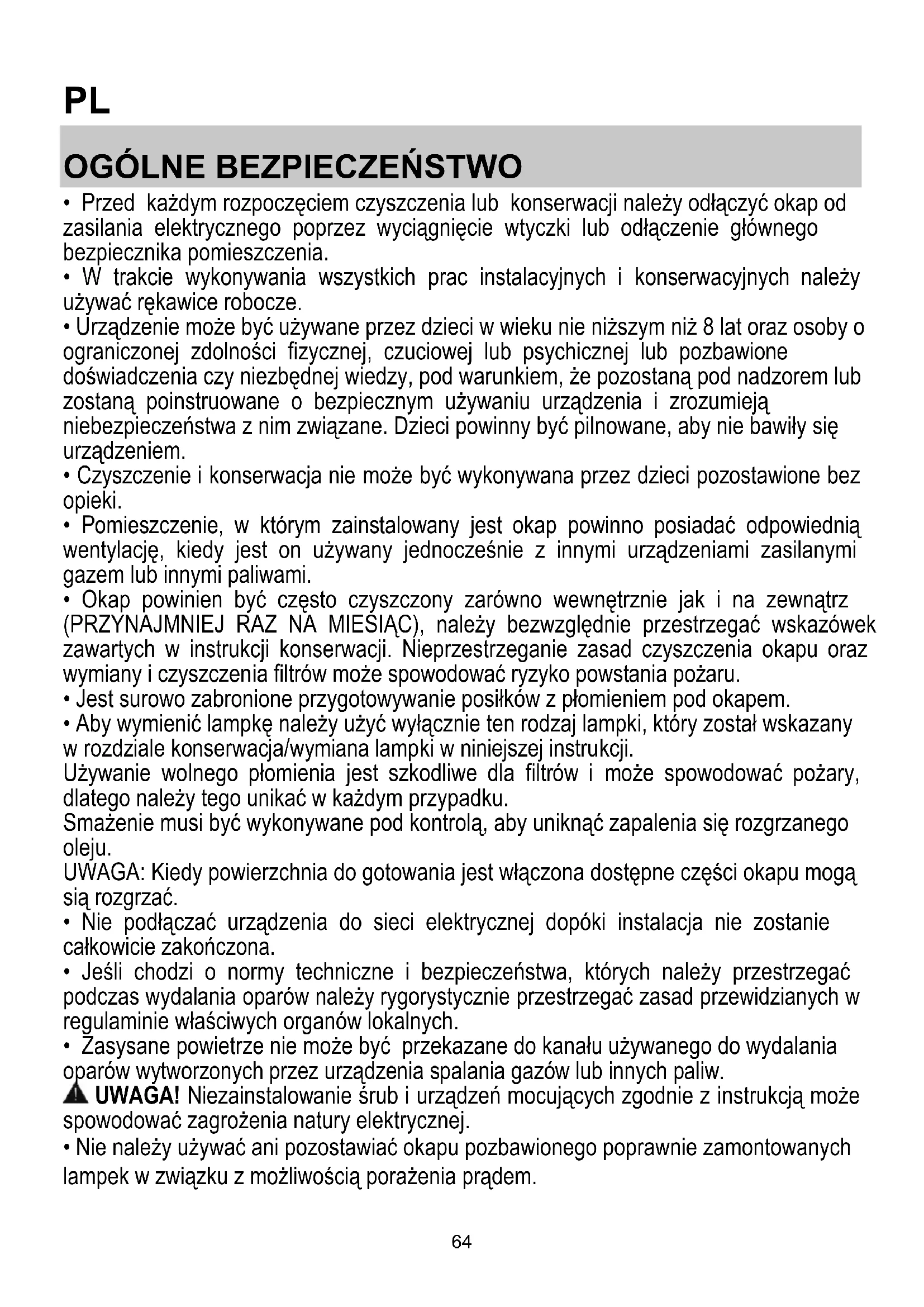 - Okap powinien być często czyszczony zarówno wewnętrznie jak i na zewnątrz (PRZYNAJMNIEJ RAZ NA MIESIĄC), należy bezwzględnie przestrzegać wskazówek zawartych w instrukcji konserwacji. Nieprzestrzeganie zasad czyszczenia okapu oraz wymiany i czyszczenia filtrów może spowodować ryzyko powstania pożaru.