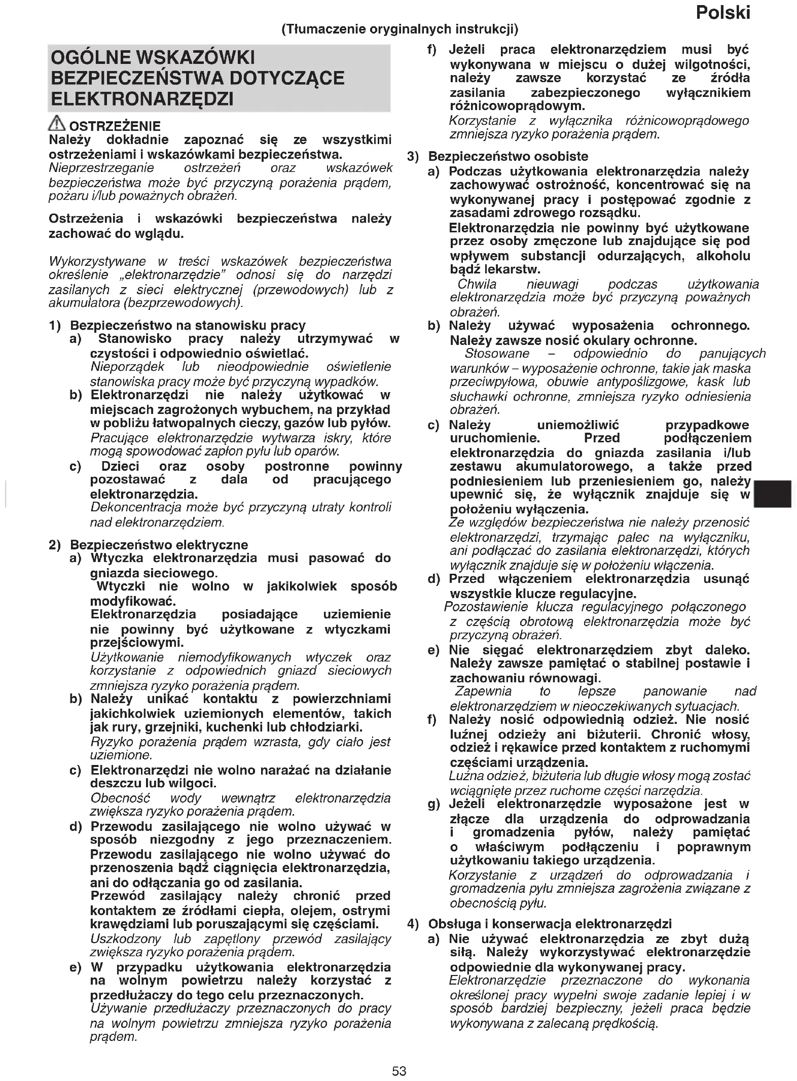 ELEKTRONARZĘDZI OSTRZEŻENIE Należy dokładnie zapoznać się ze wszystkimi ostrzeżeniami i wskazówkami bezpieczeństwa. Nieprzestrzeganie ostrzeżeń oraz wskazówek bezpieczeństwa może być przyczyną porażenia prądem, pożaru i/lub poważnych obrażeń. Ostrzeżenia i wskazówki bezpieczeństwa należy zachować do wglądu. Wykorzystywane w treści wskazówek bezpieczeństwa określenie „elektronarzędzie” odnosi się do narzędzi zasilanych z sieci elektrycznej (przewodowych) lub z akumulatora (bezprzewodowych).