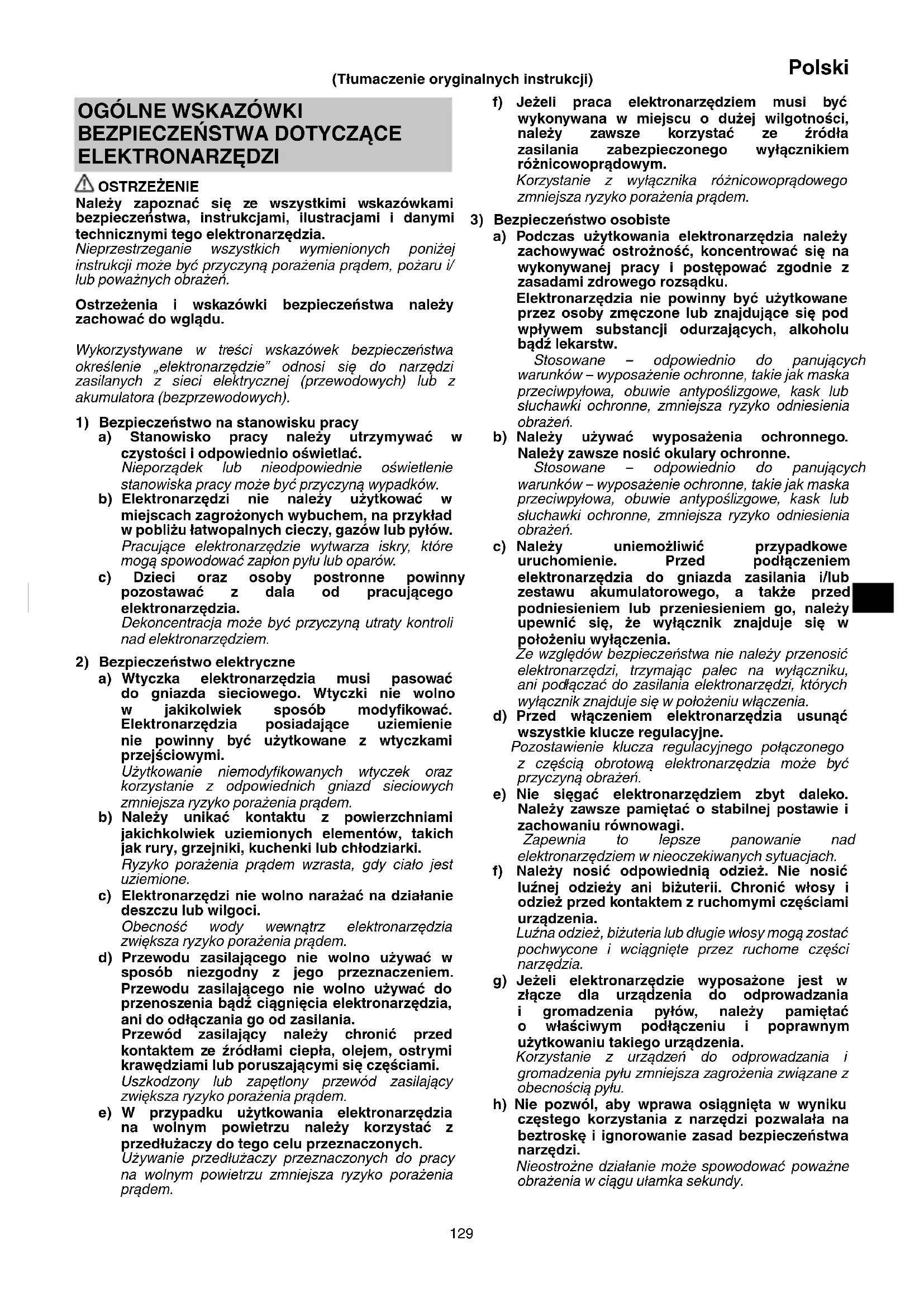 ELEKTRONARZĘDZI OSTRZEŻENIE Należy zapoznać się ze wszystkimi wskazówkami bezpieczeństwa, instrukcjami, ilustracjami i danymi technicznymi tego elektronarzędzia. Nieprzestrzeganie wszystkich wymienionych poniżej instrukcji może być przyczyną porażenia prądem, pożaru i/ lub poważnych obrażeń. Ostrzeżenia i wskazówki bezpieczeństwa należy zachować do wglądu. Wykorzystywane w treści wskazówek bezpieczeństwa określenie „elektronarzędzie” odnosi się do narzędzi zasilanych z sieci elektrycznej (przewodowych) lub z akumulatora (bezprzewodowych).