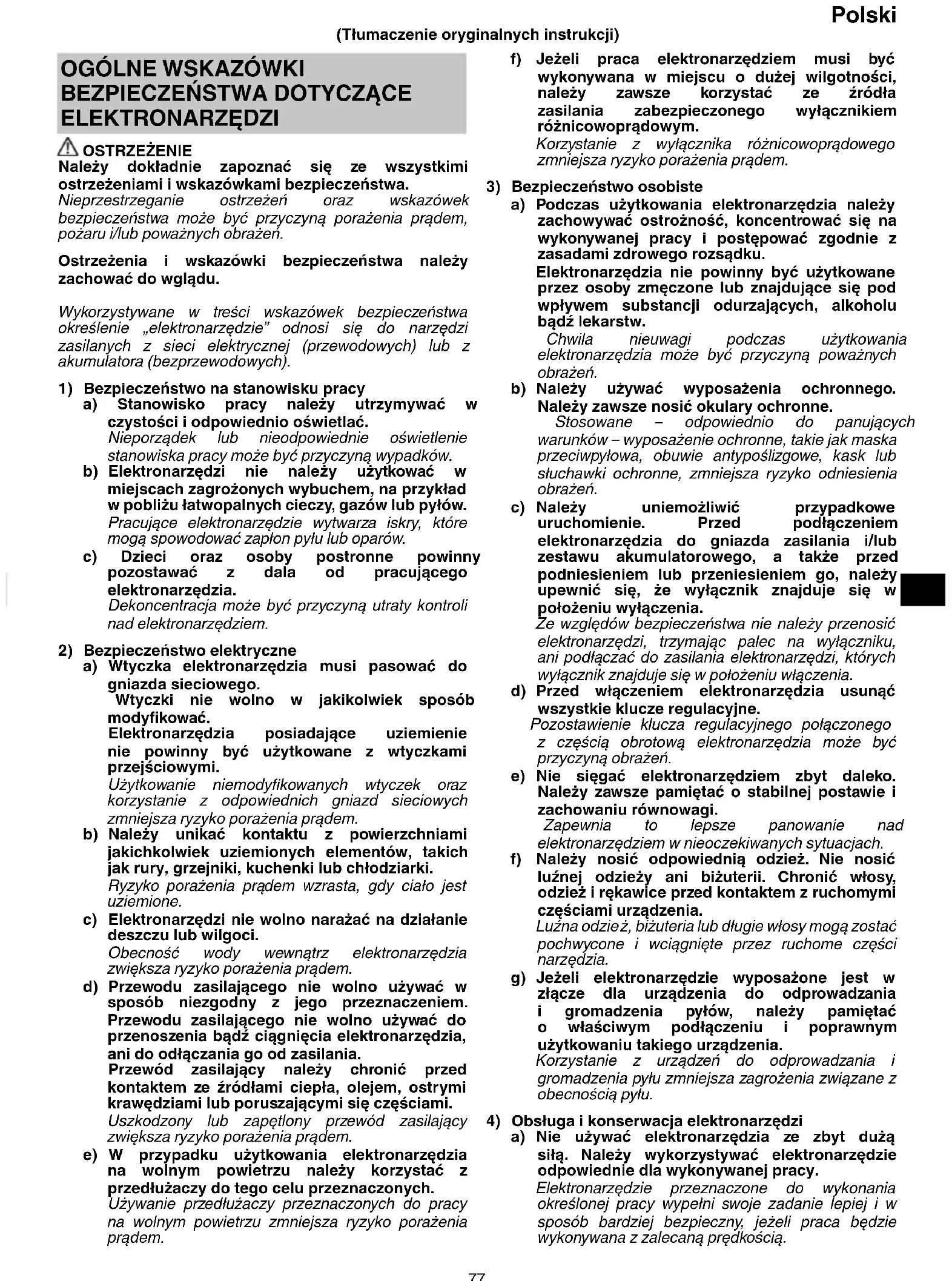 ELEKTRONARZĘDZI OSTRZEŻENIE Należy dokładnie zapoznać się ze wszystkimi ostrzeżeniami i wskazówkami bezpieczeństwa. Nieprzestrzeganie ostrzeżeń oraz wskazówek bezpieczeństwa może być przyczyną porażenia prądem, pożaru i/lub poważnych obrażeń. Ostrzeżenia i wskazówki bezpieczeństwa należy zachować do wglądu. Wykorzystywane w treści wskazówek bezpieczeństwa określenie „elektronarzędzie” odnosi się do narzędzi zasilanych z sieci elektrycznej (przewodowych) lub z akumulatora (bezprzewodowych).