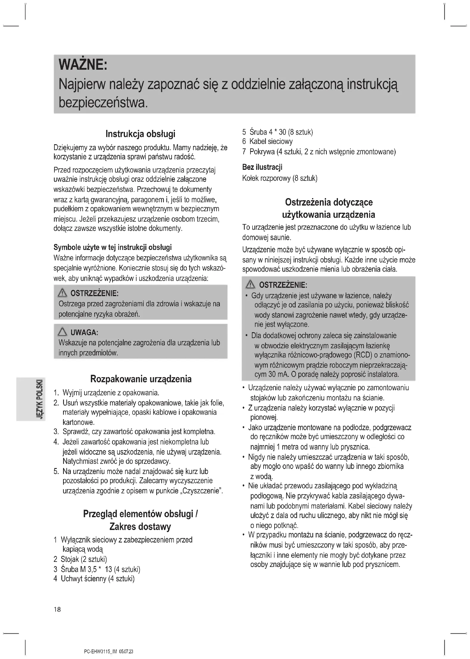 pozostałości po produkcji. Zalecamy wyczyszczenie urządzenia zgodnie z opisem w punkcie „Czyszczenie”. Przegląd elementów obsługi / Zakres dostawy 1 Wyłącznik sieciowy z zabezpieczeniem przed kapiącą wodą 2 Stojak (2 sztuki) 3 Śruba M 3,5 * 13 (4 sztuki) 4 Uchwyt ścienny (4 sztuki) 5 Śruba 4 * 30 (8 sztuk) 6 Kabel sieciowy 7 Pokrywa (4 sztuki, 2 z nich wstępnie zmontowane) Bez ilustracji Kołek rozporowy (8 sztuk) Ostrzeżenia dotyczące użytkowania urządzenia To urządzenie jest przeznaczone do użytku w łazience lub domowej saunie. Urządzenie może być używane wyłącznie w sposób opi- sany w niniejszej instrukcji obsługi. Każde inne użycie może spowodować uszkodzenie mienia lub obrażenia ciała. OSTRZEŻENIE: