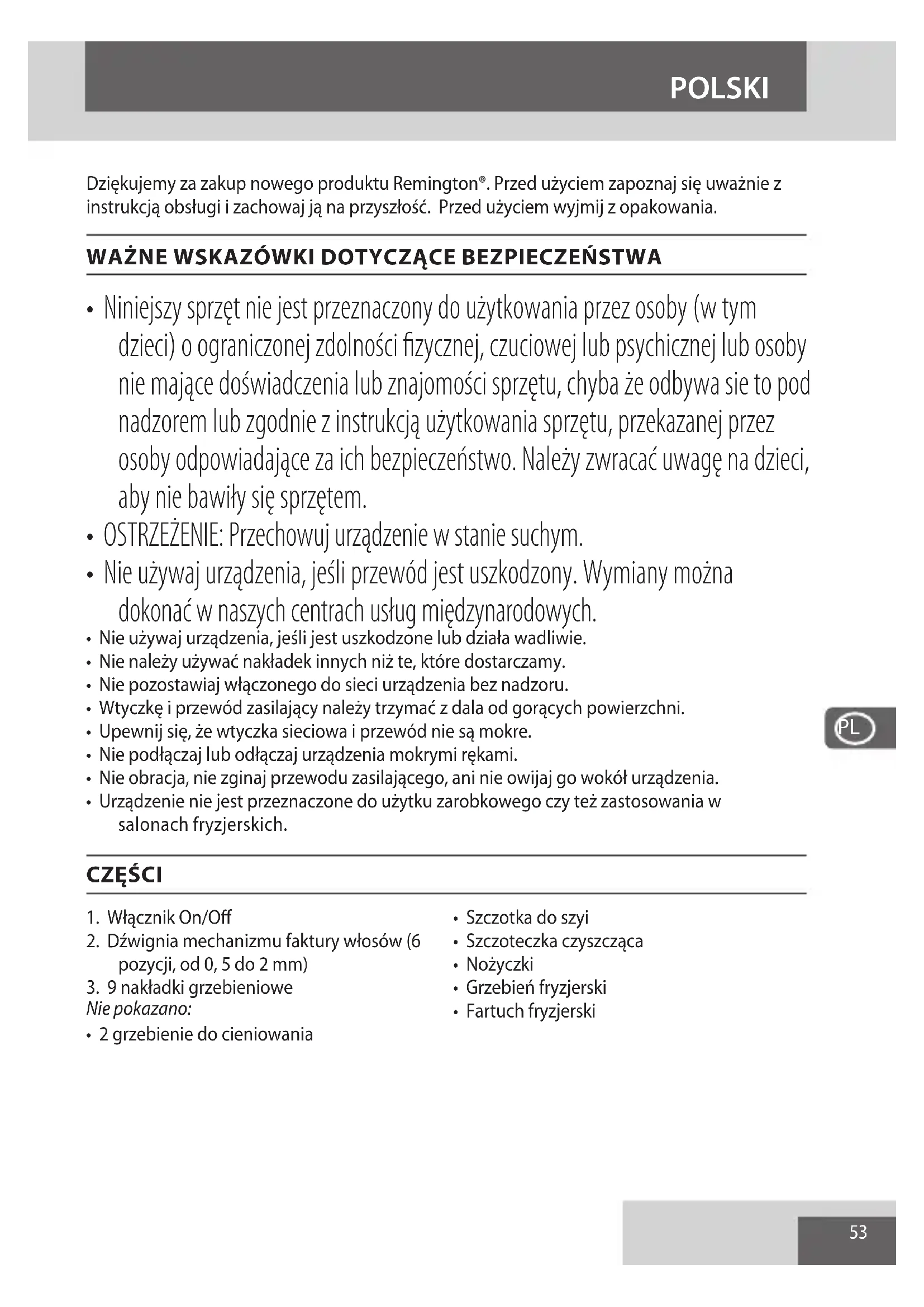 - Urządzenie nie jest przeznaczone do użytku zarobkowego czy też zastosowania w salonach fryzjerskich. CZĘŚCI