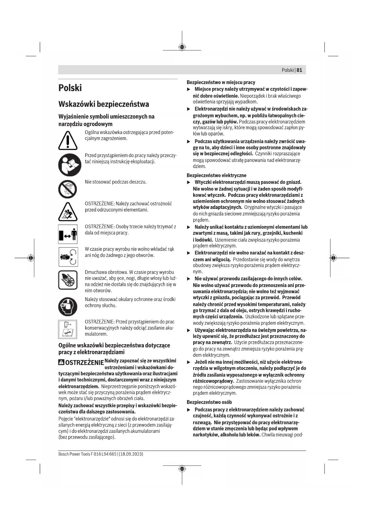 Karasoku Mahallesi 28028. Sokak No:20/A Merkez / ADANA Tel.: +903223599710 -3521379 Fax: +903223591323 E-mail: isiklar@isiklarelektrik.com Diğer servis adreslerini şurada bulabilirsiniz: www.bosch-pt.com/serviceaddresses Nakliye Önerilen Lityum İyon aküler tehlikeli madde taşıma yönetmeliği hükümlerine tabidir. Aküler başka bir yükümlülük olmaksızın kullanıcı tarafından caddeler üzerinde taşınabilir. Üçüncü kişiler eliyle yollanma durumunda (örneğin hava yolu ile veya nakliye şirketleri ile) paketleme ve etiketlemeye ilişkin özel hükümlere uyulmalıdır. Gönderi paketlenirken bir tehlikeli madde uzmanından yardım alınmalıdır. Aküleri sadece ve ancak gövdelerinde hasar yoksa gönderin. Açık kontakları kapatın ve aküyü ambalaj içinde hareket etmeyecek biçimde paketleyin. Lütfen olası ek ulusal yönetmelik hükümlerine de uyun. Tasfiye Ürünler, aküler, aksesuar ve ambalaj malzemesi çevre dostu yeniden kazanım merkezine gönderilmek zorundadır. ürünleri ve aküleri/bataryaları evsel çöplerin içine atmayın! Sadece AB ülkeleri için: 2012/19/EU yönetmeliği uyarınca kullanım ömrünü tamamlamış ürünler ve 2006/66/EC yönetmeliği uyarınca arızalı veya kullanım ömrünü tamamlamış aküler/ bataryalar ayrı ayrı toplanmak ve çevre dostu tasfiye için bir geri dönüşüm merkezine gönderilmek zorundadır. Atık elektrikli ve elektronik ekipmanlar uygun şekilde imha edilmezse olası tehlikeli maddelerin varlığı nedeniyle çevre ve insan sağlığı üzerinde zararlı etkileri olabilir. Aküler/bataryalar: Lityum iyon: Lütfen nakliye bölümündeki talimata uyun (Bakınız „Nakliye“, Sayfa80). F 016 L94 665 | (18.09.2023) Bosch Power ToolsPolski | 81 Polski Wskazówki bezpieczeństwa Wyjaśnienie symboli umieszczonych na narzędziu ogrodowym Ogólna wskazówka ostrzegająca przed poten- cjalnym zagrożeniem. Przed przystąpieniem do pracy należy przeczy- tać niniejszą instrukcję eksploatacji. Nie stosować podczas deszczu. OSTRZEŻENIE: Należy zachować ostrożność przed odrzuconymi elementami. OSTRZEŻENIE: Osoby trzecie należy trzymać z dala od miejsca pracy. W czasie pracy wyrobu nie wolno wkładać rąk ani nóg do żadnego z jego otworów. Dmuchawa obrotowa. W czasie pracy wyrobu nie uważać, aby ęce, nogi, długie włosy lub luź- na odzież nie dostała się do znajdujących się w nim otworów. Należy stosować okulary ochronne oraz środki ochrony słuchu. OSTRZEŻENIE: Przed przystąpieniem do prac konserwacyjnych należy odciąć zasilanie aku- mulatorem. Ogólne wskazówki bezpieczeństwa dotyczące pracy z elektronarzędziami OSTRZEŻENIE Należy zapoznać się ze wszystkimi ostrzeżeniami i wskazówkami do- tyczącymi bezpieczeństwa użytkowania oraz ilustracjami i danymi technicznymi, dostarczonymi wraz z niniejszym elektronarzędziem. Nieprzestrzeganie poniższych wskazó- wek może stać się przyczyną porażenia prądem elektrycz- nym, pożaru i/lub poważnych obrażeń ciała. Należy zachować wszystkie przepisy i wskazówki bezpie- czeństwa dla dalszego zastosowania. Pojęcie "elektronarzędzie" odnosi się do elektronarzędzi za- silanych energią elektryczną z sieci (z przewodem zasilają- cym) i do elektronarzędzi zasilanych akumulatorami (bezprzewodu zasilającego). Bezpieczeństwo w miejscu pracy u Miejsce pracy należy utrzymywać w czystości i zapew- nić dobre oświetlenie. Nieporządek i brak właściwego oświetlenia sprzyjają wypadkom. u Elektronarzędzi nie należy używać w środowiskach za- grożonym wybuchem, np. w pobliżu łatwopalnych cie- czy, gazów lub pyłów. Podczas pracy elektronarzędziem wytwarzają się iskry, które mogą spowodować zapłon py- łów lub oparów. u Podczas użytkowania urządzenia należy zwrócić uwa- gę na to, aby dzieci i inne osoby postronne znajdowały się w bezpiecznej odległości. Czynniki rozpraszające mogą spowodować utratę panowania nad elektronarzę- dziem. Bezpieczeństwo elektryczne u Wtyczki elektronarzędzi muszą pasować do gniazd. Nie wolno w żadnej sytuacji i w żaden sposób modyfi- kować wtyczek. Podczas pracy elektronarzędziami z uziemieniem ochronnym nie wolno stosować żadnych wtyków adaptacyjnych. Oryginalne wtyczki i pasujące do nich gniazda sieciowe zmniejszają ryzyko porażenia prądem. u Należy unikać kontaktu z uziemionymi elementami lub zwartymi z masą, takimi jak rury, grzejniki, kuchenki ilodówki. Uziemienie ciała zwiększa ryzyko porażenia prądem elektrycznym. u Elektronarzędzi nie wolno narażać na kontakt z desz- czem ani wilgocią. Przedostanie się wody do wnętrza obudowy zwiększa ryzyko porażenia prądem elektrycz- nym. u Nie używać przewodu zasilającego do innych celów. Nie wolno używać przewodu do przenoszenia ani prze- suwania elektronarzędzia; nie wolno też wyjmować wtyczki z gniazda, pociągając za przewód. Przewód należy chronić przed wysokimi temperaturami, należy go trzymać zdala od oleju, ostrych krawędzi i rucho- mych części urządzenia. Uszkodzone lub splątane prze- wody zwiększają ryzyko porażenia prądem elektrycznym. u Używając elektronarzędzia na świeżym powietrzu, na- leży upewnić się, że przedłużacz jest przeznaczony do pracy na zewnątrz. Użycie przedłużacza przeznaczone- go do pracy na zewnątrz zmniejsza ryzyko porażenia prą- dem elektrycznym. u Jeżeli nie ma innej możliwości, niż użycie elektrona- rzędzia w wilgotnym otoczeniu, należy podłączyć je do źródła zasilania wyposażonego w wyłącznik ochronny różnicowoprądowy. Zastosowanie wyłącznika ochron- nego różnicowoprądowego zmniejsza ryzyko porażenia prądem elektrycznym. Bezpieczeństwo osób u Podczas pracy z elektronarzędziem należy zachować czujność, każdą czynność wykonywać ostrożnie i z rozwagą. Nie przystępować do pracy elektronarzę- dziem w stanie zmęczenia lub będąc pod wpływem narkotyków, 