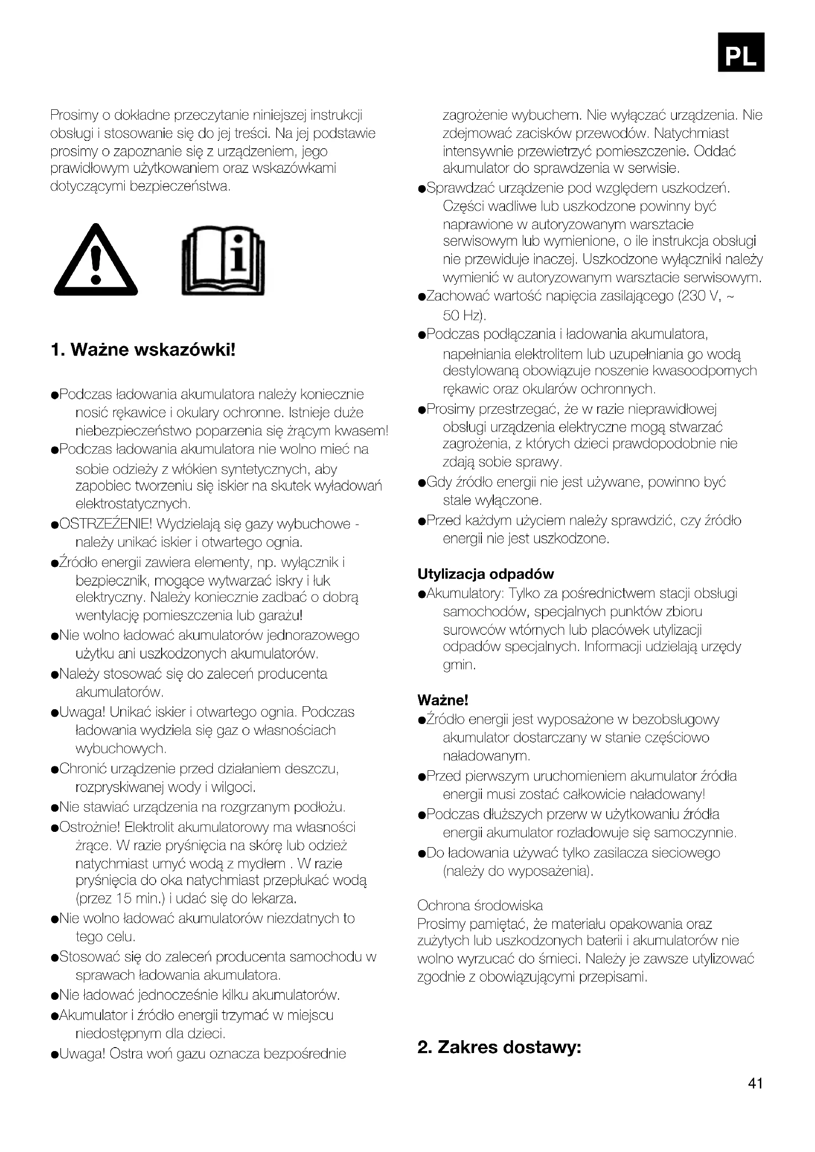 Podczas ładowania akumulatora należy koniecznie nosić rękawice i okulary ochronne. Istnieje duże niebezpieczeństwo poparzenia się żrącym kwasem! Podczas ładowania akumulatora nie wolno mieć na sobie odzieży z włókien syntetycznych, aby zapobiec tworzeniu się iskier na skutek wyładowań elektrostatycznych. OSTRZEŹENIE! Wydzielają się gazy wybuchowe - należy unikać iskier i otwartego ognia. Źródło energii zawiera elementy, np. wyłącznik i bezpiecznik, mogące wytwarzać iskry i łuk elektryczny. Należy koniecznie zadbać o dobrą wentylację pomieszczenia lub garażu! Nie wolno ładować akumulatorów jednorazowego użytku ani uszkodzonych akumulatorów. Należy stosować się do zaleceń producenta akumulatorów. Uwaga! Unikać iskier i otwartego ognia. Podczas ładowania wydziela się gaz o własnościach wybuchowych. Chronić urządzenie przed działaniem deszczu, rozpryskiwanej wody i wilgoci. Nie stawiać urządzenia na rozgrzanym podłożu. Ostrożnie! Elektrolit akumulatorowy ma własności żrące. W razie pryśnięcia na skórę lub odzież natychmiast umyć wodą z mydłem . W razie pryśnięcia do oka natychmiast przepłukać wodą (przez 15 min.) i udać się do lekarza. Nie wolno ładować akumulatorów niezdatnych to tego celu. Stosować się do zaleceń producenta samochodu w sprawach ładowania akumulatora. Nie ładować jednocześnie kilku akumulatorów. Akumulator i źródło energii trzymać w miejscu niedostępnym dla dzieci. Uwaga! Ostra woń gazu oznacza bezpośrednie zagrożenie wybuchem. Nie wyłączać urządzenia. Nie zdejmować zacisków przewodów. Natychmiast intensywnie przewietrzyć pomieszczenie. Oddać akumulator do sprawdzenia w serwisie. Sprawdzać urządzenie pod względem uszkodzeń. Części wadliwe lub uszkodzone powinny być naprawione w autoryzowanym warsztacie serwisowym lub wymienione, o ile instrukcja obsługi nie przewiduje inaczej. Uszkodzone wyłączniki należy wymienić w autoryzowanym warsztacie serwisowym. Zachować wartość napięcia zasilającego (230 V, ~ 50 Hz). Podczas podłączania i ładowania akumulatora, napełniania elektrolitem lub uzupełniania go wodą destylowaną obowiązuje noszenie kwasoodpornych rękawic oraz okularów ochronnych. Prosimy przestrzegać, że w razie nieprawidłowej obsługi urządzenia elektryczne mogą stwarzać zagrożenia, z których dzieci prawdopodobnie nie zdają sobie sprawy. Gdy źródło energii nie jest używane, powinno być stale wyłączone. Przed każdym użyciem należy sprawdzić, czy źródło energii nie jest uszkodzone. Utylizacja odpadów Akumulatory: Tylko za pośrednictwem stacji obsługi samochodów, specjalnych punktów zbioru surowców wtórnych lub placówek utylizacji odpadów specjalnych. Informacji udzielają urzędy gmin. Ważne! Źródło energii jest wyposażone w bezobsługowy akumulator dostarczany w stanie częściowo naładowanym. Przed pierwszym uruchomieniem akumulator źródła energii musi zostać całkowicie naładowany! Podczas dłuższych przerw w użytkowaniu źródła energii akumulator rozładowuje się samoczynnie. Do ładowania używać tylko zasilacza sieciowego (należy do wyposażenia). Ochrona środowiska Prosimy pamiętać, że materiału opakowania oraz zużytych lub uszkodzonych baterii i akumulatorów nie wolno wyrzucać do śmieci. Należy je zawsze utylizować zgodnie z obowiązującymi przepisami.