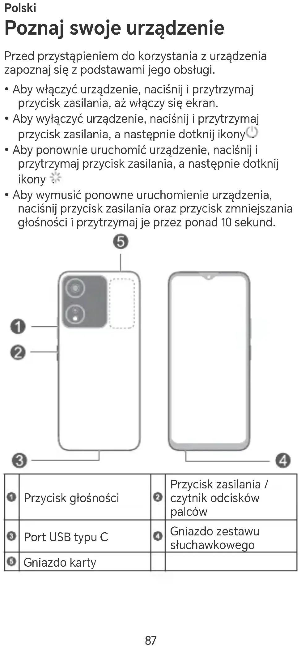 - Aby wymusić ponowne uruchomienie urządzenia, naciśnij przycisk zasilania oraz przycisk zmniejszania głośności i przytrzymaj je przez ponad 10 sekund.