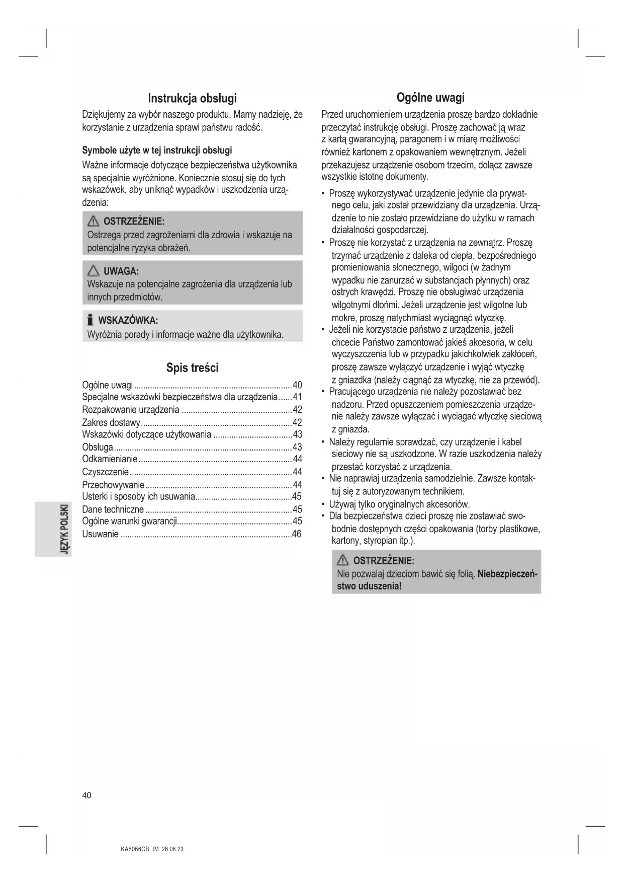 - Dla bezpieczeństwa dzieci proszę nie zostawiać swo- bodnie dostępnych części opakowania (torby plastikowe, kartony, styropian itp.). OSTRZEŻENIE: Nie pozwalaj dzieciom bawić się folią. Niebezpieczeń- stwo uduszenia!KA6066CB_IM 26.06.23