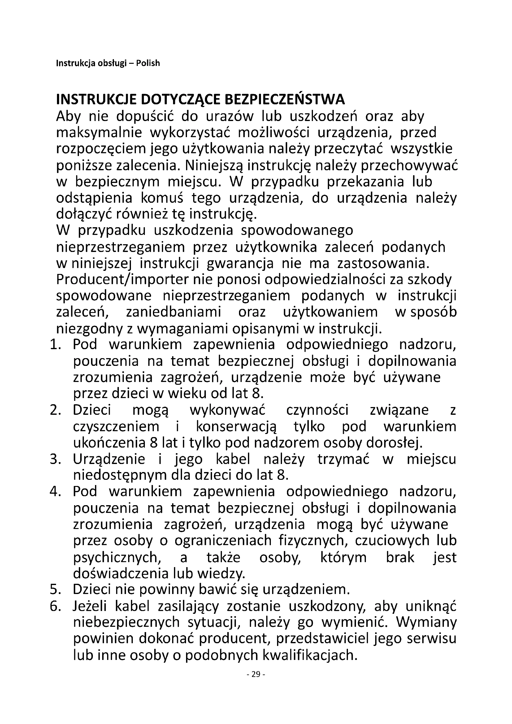 Aby nie dopuścić do urazów lub uszkodzeń oraz aby maksymalnie wykorzystać możliwości urządzenia, przed rozpoczęciem jego użytkowania należy przeczytać wszystkie poniższe zalecenia. Niniejszą instrukcję należy przechowywać w bezpiecznym miejscu. W przypadku przekazania lub odstąpienia komuś tego urządzenia, do urządzenia należy dołączyć również tę instrukcję. W przypadku uszkodzenia spowodowanego nieprzestrzeganiem przez użytkownika zaleceń podanych w niniejszej instrukcji gwarancja nie ma zastosowania. Producent/importer nie ponosi odpowiedzialności za szkody spowodowane nieprzestrzeganiem podanych w instrukcji zaleceń, zaniedbaniami oraz użytkowaniem w sposób niezgodny z wymaganiami opisanymi w instrukcji.