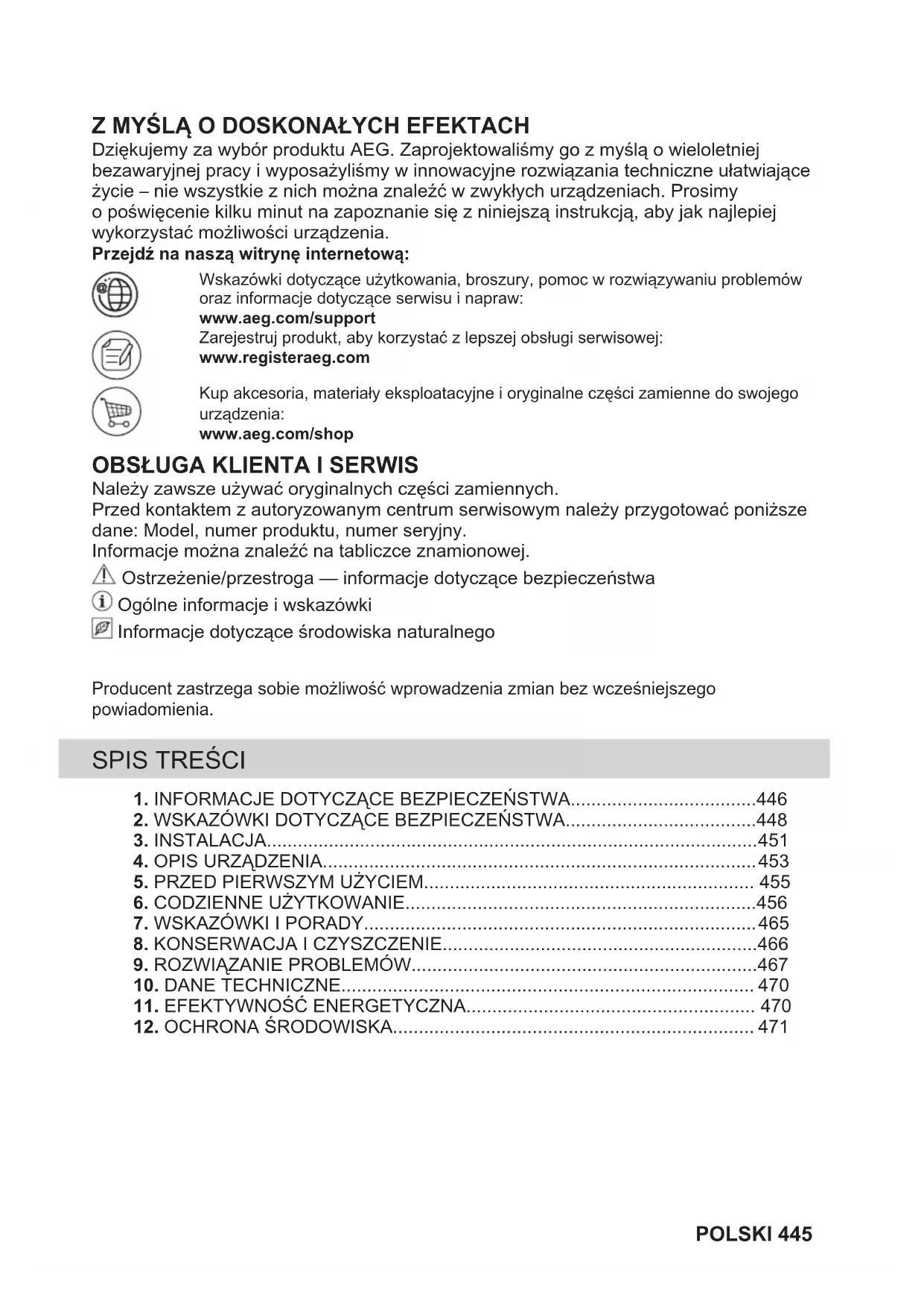 Resirkuler materialer som er merket med symbolet . Legg emballasjen i riktige beholdere for å resirkulere det. Bidrar til å beskytte miljøet, menneskers helse og for å resirkulere avfall av elektriske og elektroniske produkter. Ikke kast produkter som er merket med symbolet sammen med husholdningsavfallet. Produktet kan leveres der hvor tilsvarende produkt selges eller på miljøstasjonen i kommunen. Kontakt kommunen for nærmere opplysninger. 444 NORSKZ MYŚLĄ O DOSKONAŁYCH EFEKTACH Dziękujemy za wybór produktu AEG. Zaprojektowaliśmy go z myślą o wieloletniej bezawaryjnej pracy i wyposażyliśmy w innowacyjne rozwiązania techniczne ułatwiające życie – nie wszystkie z nich można znaleźć w zwykłych urządzeniach. Prosimy o poświęcenie kilku minut na zapoznanie się z niniejszą instrukcją, aby jak najlepiej wykorzystać możliwości urządzenia. Przejdź na naszą witrynę internetową: Wskazówki dotyczące użytkowania, broszury, pomoc w rozwiązywaniu problemóworaz informacje dotyczące serwisu i napraw:www.aeg.com/supportZarejestruj produkt, aby korzystać z lepszej obsługi serwisowej:www.registeraeg.comKup akcesoria, materiały eksploatacyjne i oryginalne części zamienne do swojegourządzenia:www.aeg.com/shop