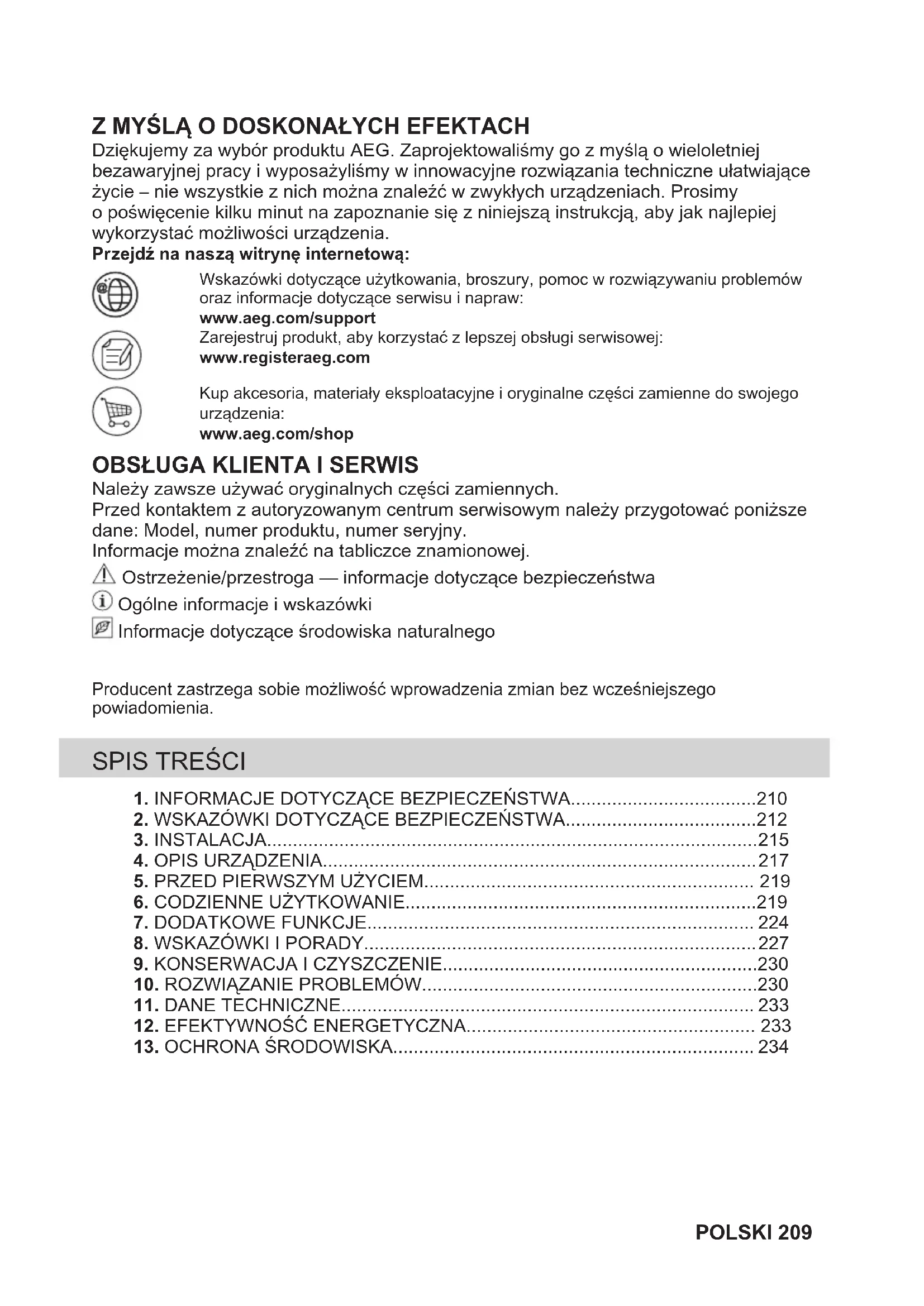 Atiduokite perdirbti medžiagas, pažymėtas šiuo ženklu . Išmeskite pakuotę į atitinkamą atliekų surinkimo konteinerį, kad ji būtų perdirbta. Padėkite saugoti aplinką bei žmonių sveikatą ir surinkti bei perdirbti elektros ir elektronikos prietaisų atliekas. Neišmeskite šiuo ženklu pažymėtų prietaisų kartu su kitomis buitinėmis atliekomis. Atiduokite šį gaminį į vietos atliekų surinkimo punktą arba susisiekite su vietos savivaldybe dėl papildomos informacijos. 208 LIETUVIŲZ MYŚLĄ O DOSKONAŁYCH EFEKTACH Dziękujemy za wybór produktu AEG. Zaprojektowaliśmy go z myślą o wieloletniej bezawaryjnej pracy i wyposażyliśmy w innowacyjne rozwiązania techniczne ułatwiające życie – nie wszystkie z nich można znaleźć w zwykłych urządzeniach. Prosimy o poświęcenie kilku minut na zapoznanie się z niniejszą instrukcją, aby jak najlepiej wykorzystać możliwości urządzenia. Przejdź na naszą witrynę internetową: Wskazówki dotyczące użytkowania, broszury, pomoc w rozwiązywaniu problemóworaz informacje dotyczące serwisu i napraw:www.aeg.com/supportZarejestruj produkt, aby korzystać z lepszej obsługi serwisowej:www.registeraeg.comKup akcesoria, materiały eksploatacyjne i oryginalne części zamienne do swojegourządzenia:www.aeg.com/shop