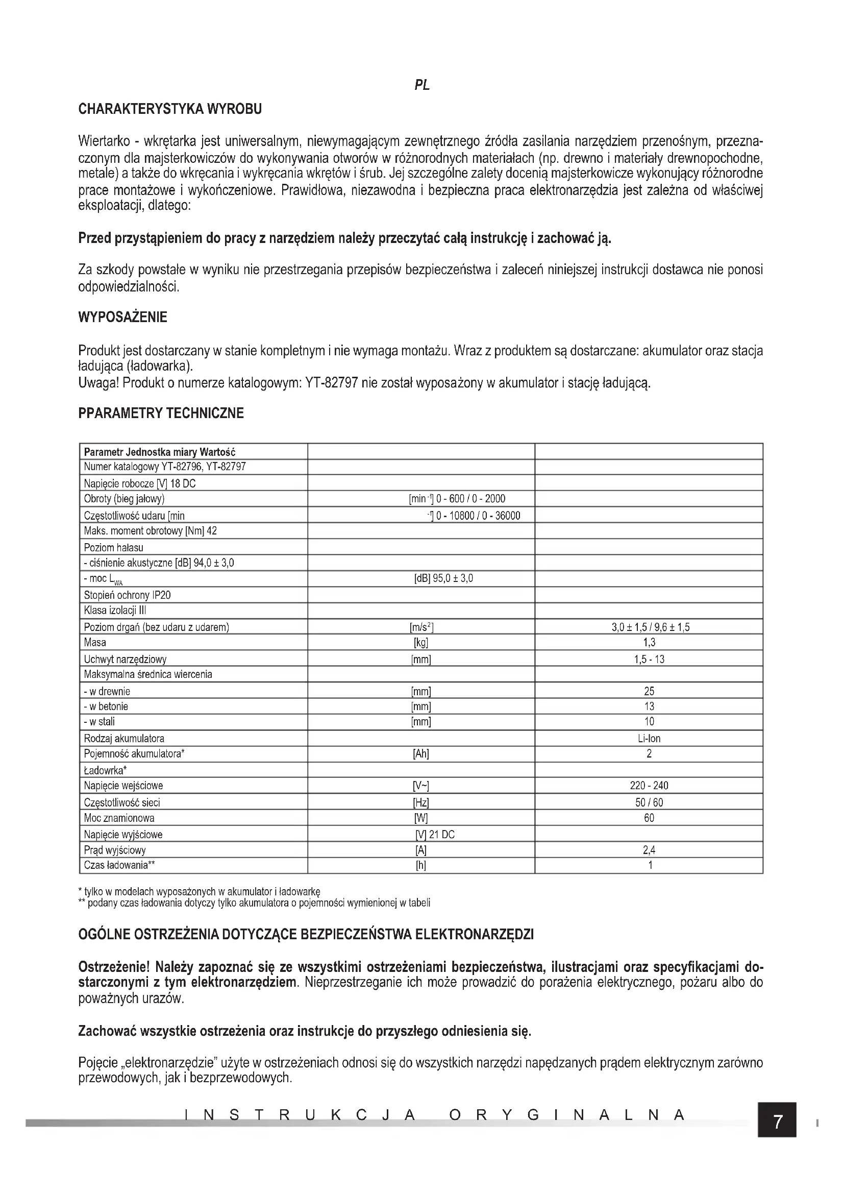 CHARAKTERYSTYKA WYROBU Wiertarko - wkrętarka jest uniwersalnym, niewymagającym zewnętrznego źródła zasilania narzędziem przenośnym, przezna- czonym dla majsterkowiczów do wykonywania otworów w różnorodnych materiałach (np. drewno i materiały drewnopochodne, metale) a także do wkręcania i wykręcania wkrętów i śrub. Jej szczególne zalety docenią majsterkowicze wykonujący różnorodne prace montażowe i wykończeniowe. Prawidłowa, niezawodna i bezpieczna praca elektronarzędzia jest zależna od właściwej eksploatacji, dlatego: Przed przystąpieniem do pracy z narzędziem należy przeczytać całą instrukcję i zachować ją. Za szkody powstałe w wyniku nie przestrzegania przepisów bezpieczeństwa i zaleceń niniejszej instrukcji dostawca nie ponosi odpowiedzialności. WYPOSAŻENIE Produkt jest dostarczany w stanie kompletnym i nie wymaga montażu. Wraz z produktem są dostarczane: akumulator oraz stacja ładująca (ładowarka). Uwaga! Produkt o numerze katalogowym: YT-82797 nie został wyposa żony w akumulator i stację ładującą. PPARAMETRY TECHNICZNE Parametr Jednostka miary Wartość Numer katalogowy YT-82796, YT-82797 Napięcie robocze [V] 18 DC Obroty (bieg jałowy) [min