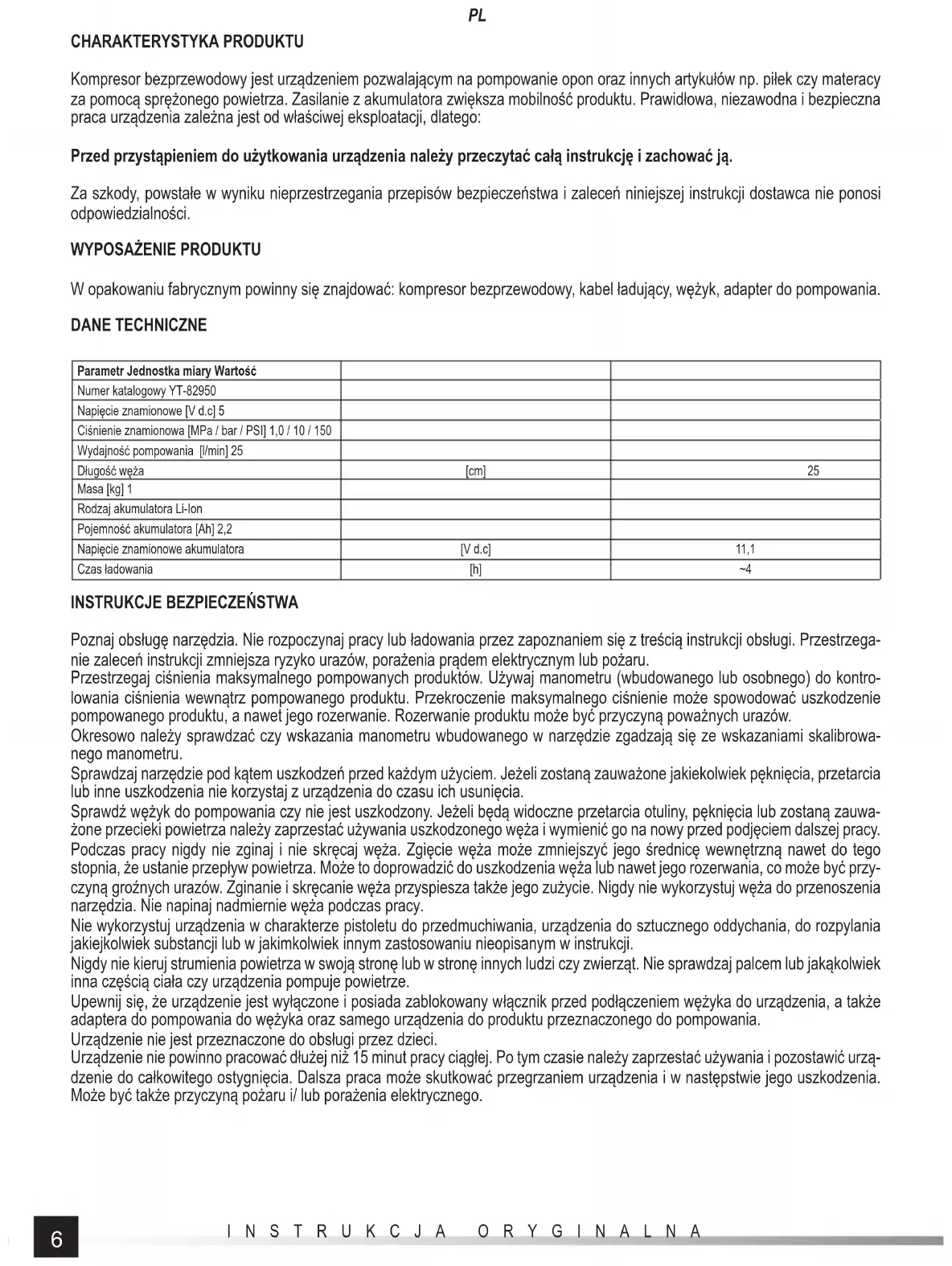 INSTRUKCJA OBSŁUGI YT-82950 Yato