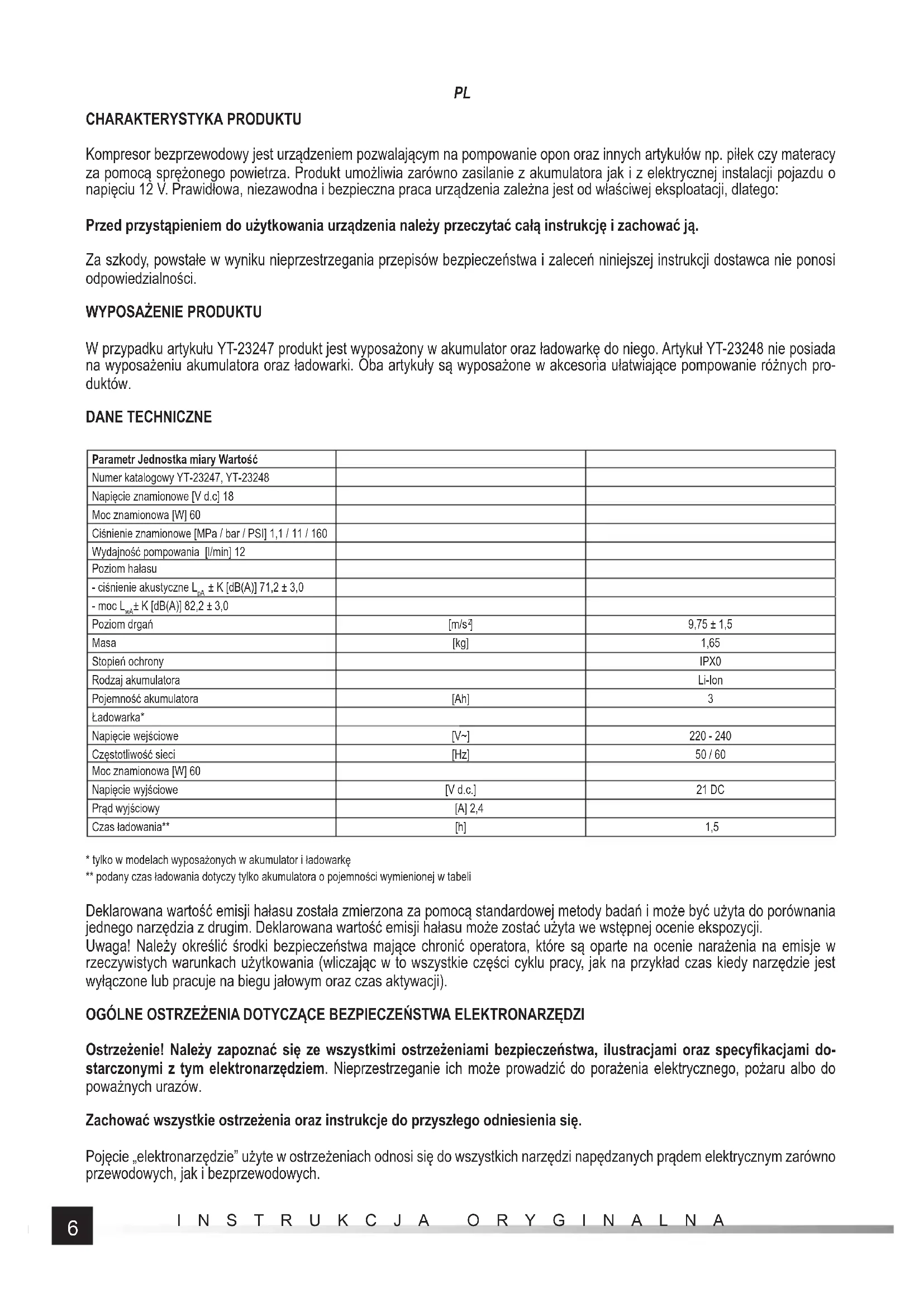W przypadku artykułu YT-23247 produkt jest wyposażony w akumulator oraz ładowarkę do niego. Artykuł YT-23248 nie posiada na wyposażeniu akumulatora oraz ładowarki. Oba artykuły są wyposażone w akcesoria ułatwiające pompowanie różnych pro- duktów. DANE TECHNICZNE Parametr Jednostka miary Wartość Numer katalogowy YT-23247, YT-23248 Napięcie znamionowe [V d.c] 18 Moc znamionowa [W] 60 Ciśnienie znamionowe [MPa / bar / PSI] 1,1 / 11 / 160 Wydajność pompowania [l/min] 12 Poziom hałasu - ciśnienie akustyczne L