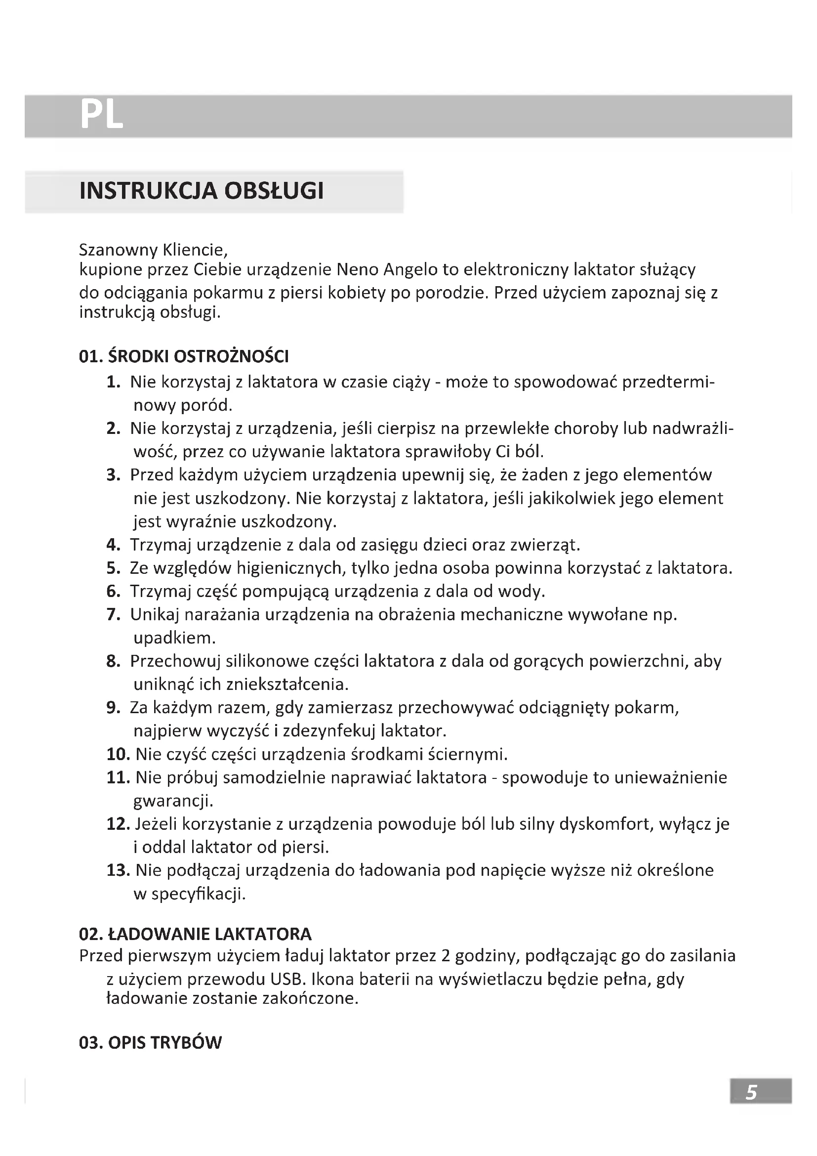 Szanowny Kliencie, kupione przez Ciebie urządzenie Neno Angelo to elektroniczny laktator służący do odciągania pokarmu z piersi kobiety po porodzie. Przed użyciem zapoznaj się z instrukcją obsługi.