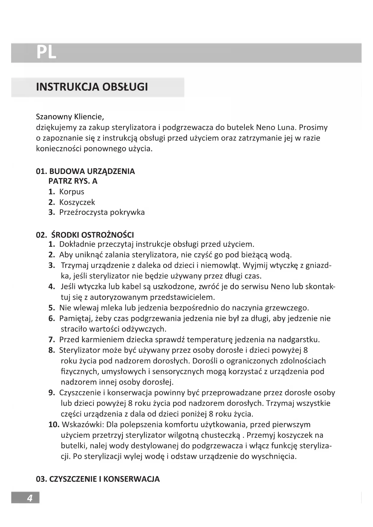 Szanowny Kliencie, dziękujemy za zakup sterylizatora i podgrzewacza do butelek Neno Luna. Prosimy o zapoznanie się z instrukcją obsługi przed użyciem oraz zatrzymanie jej w razie konieczności ponownego użycia.