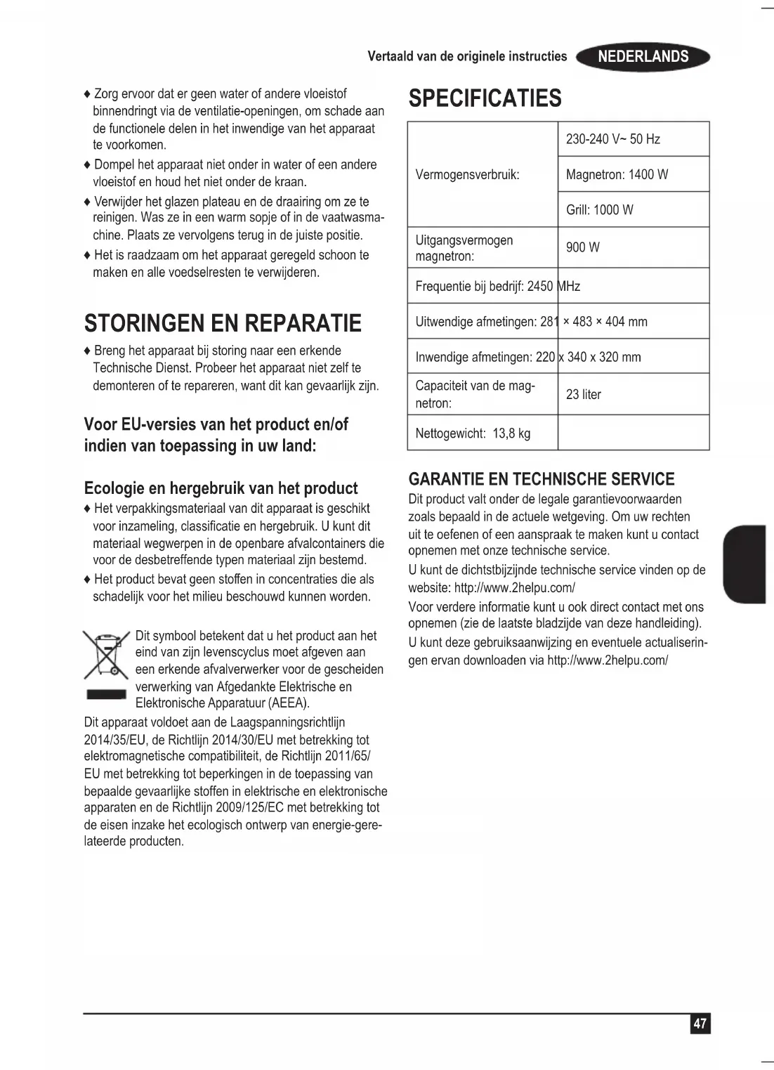 PRAWA ♦ W razie awarii zanieść urządzenie do autoryzowane- go Serwisu Technicznego. Nie próbować rozbierać urządzenia ani go naprawiać, ponieważ może to być niebezpieczne. Dla urządzeń wyprodukowanych w Unii Europejskiej i w przypadku wymagań praw- nych obowiązujących w danym kraju: Ekologia i zarządzanie odpadami ♦ Materiały, z których wykonane jest opakowanie tego urządzenia, znajdują się w ramach systemu zbierania, klasykacji oraz ich odzysku. Jeżeli chcecie Państwo się ich pozbyć, należy umieścić je w kontenerze przezna- czonym do tego typu materiałów. ♦ Produkt nie zawiera koncentracji substancji, które mogły- by być uznane za szkodliwe dla środowiska. Symbol ten oznacza, że jeśli chcecie się Państwo pozbyć tego produktu po zakończeniu okresu jego użytkowania, należy go przekazać przy zastosowaniu określonych środków do autoryzowanego podmiotu zarządzającego odpadami w celu przeprowadzenia selektywnej zbiórki Odpadów Urządzeń Elektrycznych i Elektronicz- nych (WEEE). Urządzenie spełniające wymogi Ustawy 2014/35/EU o Niskim Napięciu, Ustawy 2014/30/EU o Zgodności Elektro- magnetycznej, Ustawy 2011/65/EU o gospodarce odpada- mi elektrycznymi i elektronicznymi i ustawy 2009/125/EC o urządzeniach konsumujących energię. Specykacje Zasilanie: 230-240 V~ 50 Hz Kuchenka mikrofalowa: 1400 W Grill: 1000 W Moc wyjściowa kuchenki mikrofalowej: 900 W Częstotliwość robocza: 2450 MHz Wymiary zewnętrzne: 281 × 483 × 404 mm Wymiary wewnętrzne: 220 x 340 x 320 mm Pojemność kuchenki mikrofalowej: 23 litry Ciężar netto: 13,8 kg